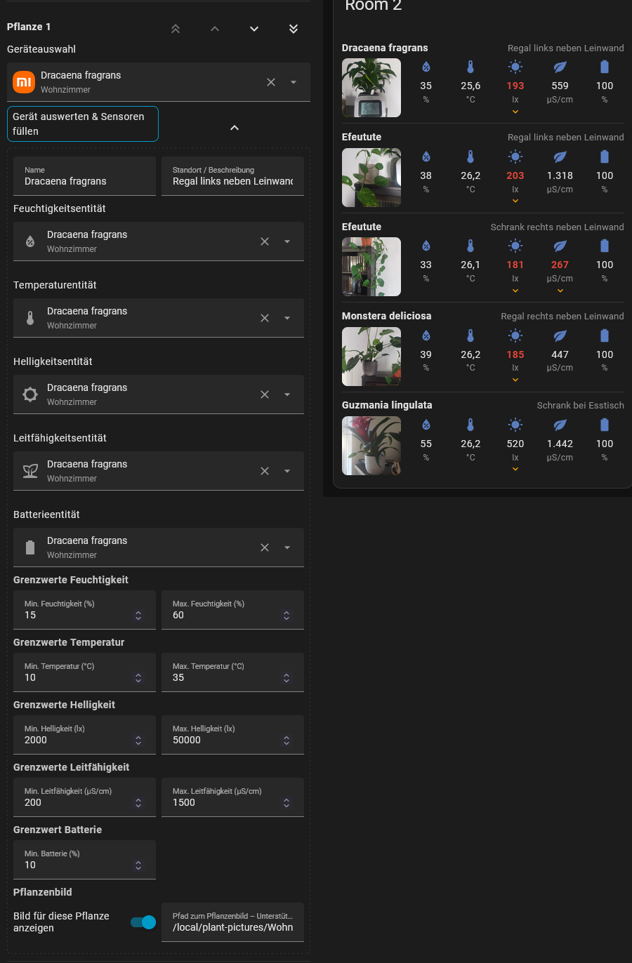 It’s designed to accomodate as many flowers in one card as you like, have a little optional preview picture, you can define your upper and lower borders for your sensors directly in the card without any need for additional configuration in any .yaml, these are shown via red color of the entity and additional chevrons and is completely configurable in the GUI.
