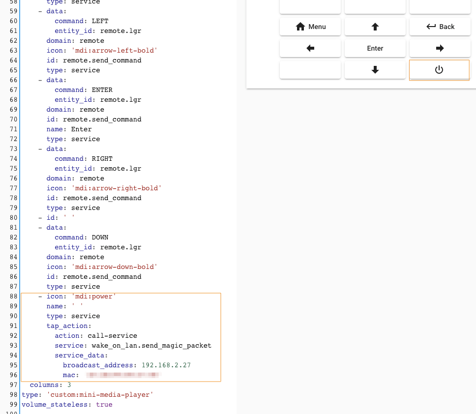 @kalkih As a big fan of your great plugins I was helping my son with his âremote controlâ for his LG TV (webostv) using your Mini Media Player card. I noticed the support of tap_action to start a service. So I created a button to start a service to turn on his tv with a WOL packet (replaced the real mac address with a fake one):