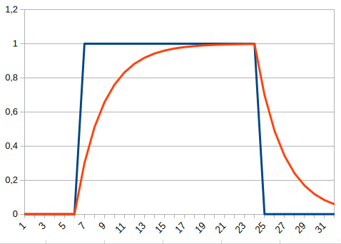 The on-cycle may be shorter or longer than shown here, so it may not reach 0.8 before cooling off again. Or it may be switched off after a long run and quickly on again, keeping the warm-up-value high. So the warm-up does not necessarily start at zero but at the value to what the “off” state cooled down the curve before.