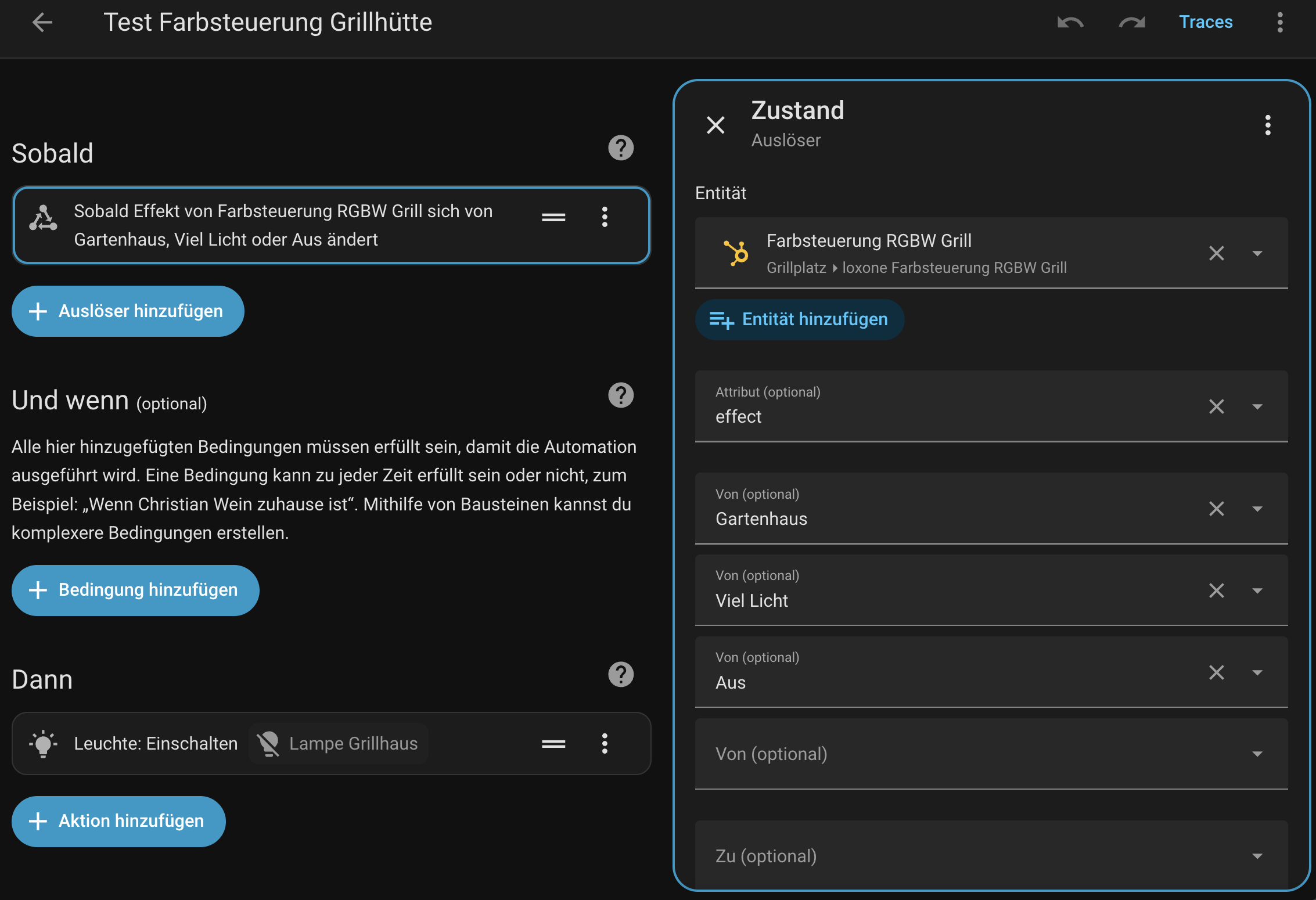 For testing, I created a simple automation in Home Assistant using the editor (initially only switching on and setting colors).