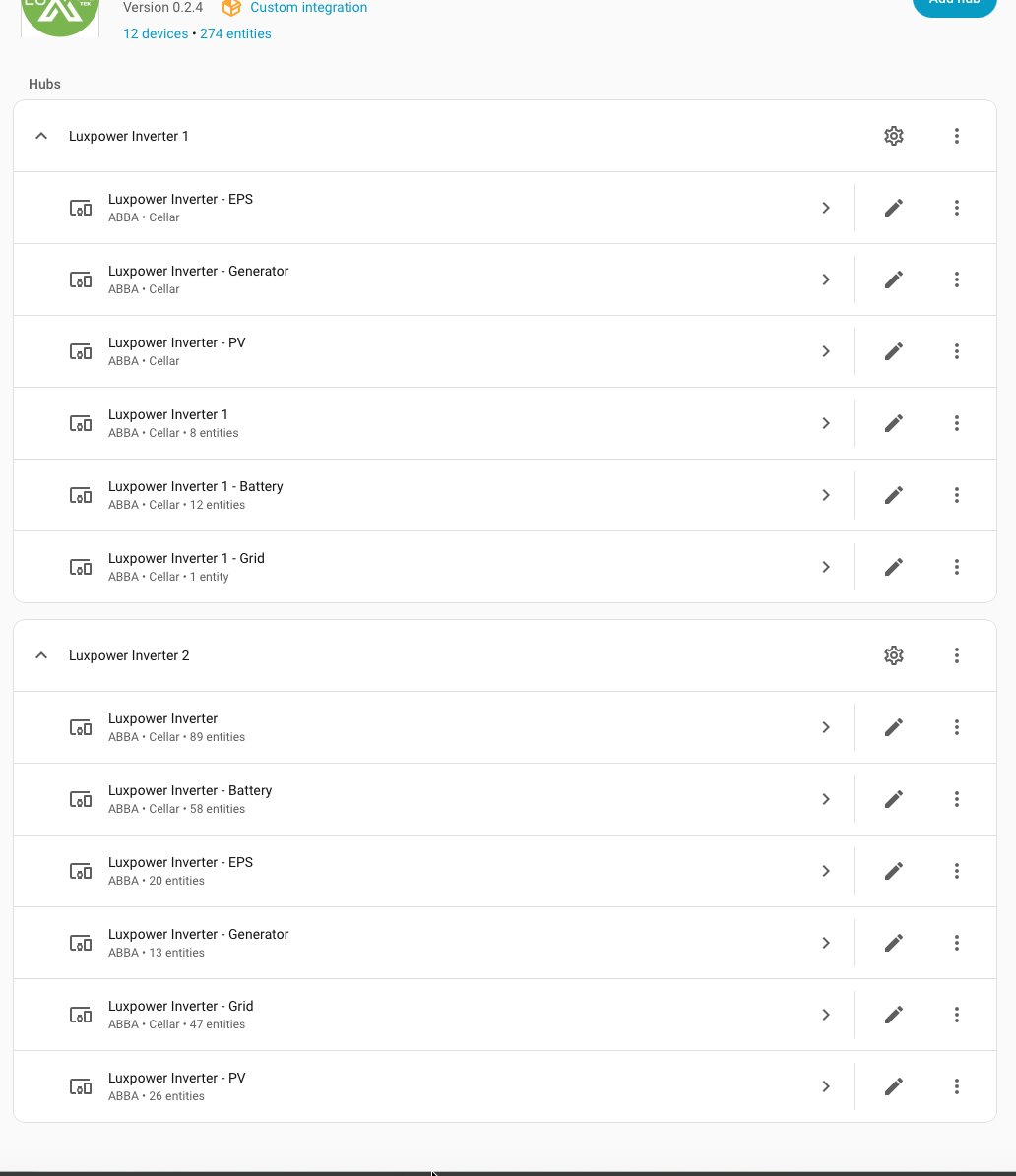 I finally got around to installing this but I haven’t quite got it sorted I don’t think. I have a pair of Squirrelpods (LXP36000) in parallel. Now, I had to get them running using the small block option and I also did them read-only for now but they connect and create. The issue I am having is it only seems to have created sensors on one of the units. Therefore I am only seeing, for example, half the solar generation. You can see that the number of entities is way bigger on one inverter and in some cases a lot of the devices have none - look at the two PV devices: