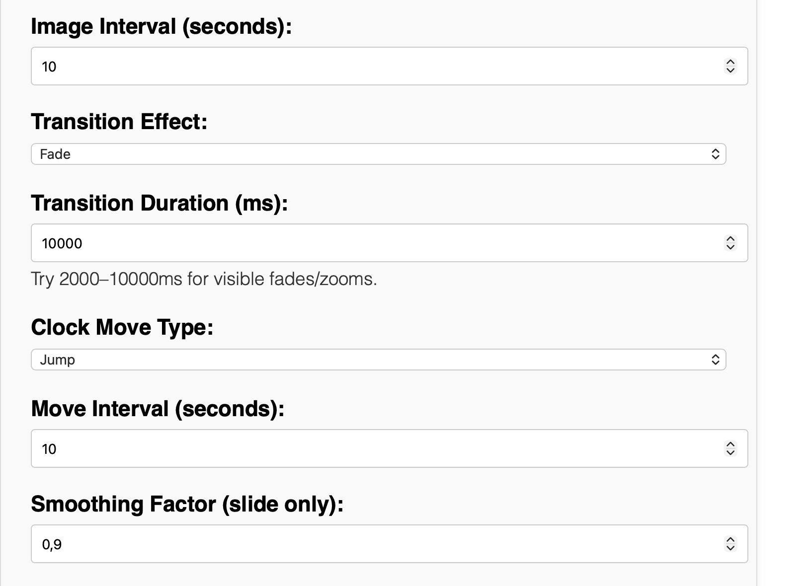 fully looks correct assuming you have plus. and setting on your screensaver admin page looks correct @ 10000 (thats very slow) so transition will be very noticable. you may need to restart fully after changing java