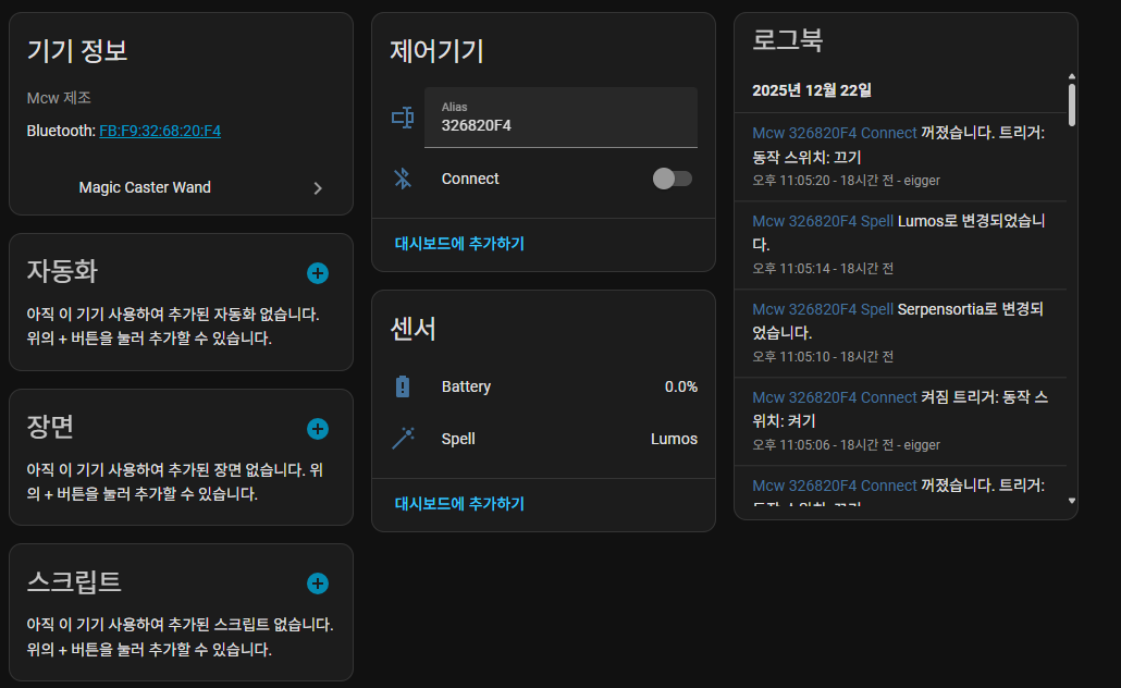 The Bluetooth “connect” requirement means you must connect to the wand via the switch entity before casting spells.