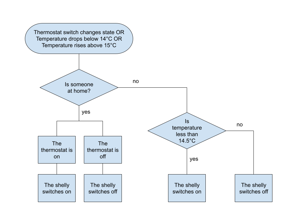 If there is some one at home, then they should control the heating in the living room using the existing thermostat. If there is no one at home, then the Shelly Switch takes over the control keeping the room above 14°C If the Home Assistant decides to stop working, the thermostat should still work.