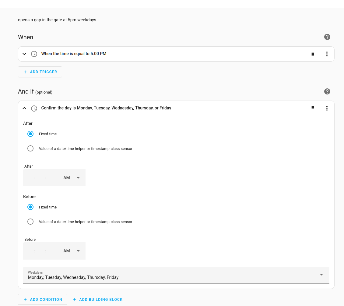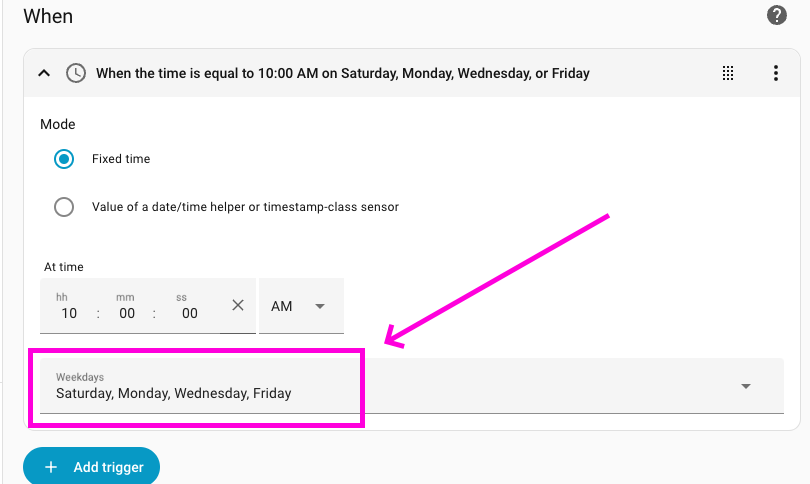 When I go into automation via the user interface (not via YAMEL editing). I can find where I say I want a trigger to happen every day at 7AM. But I don’t see how I say Monday - Friday or pick what days of the week while I am setting the time of day. No doubt this is easy and I am just missing it.