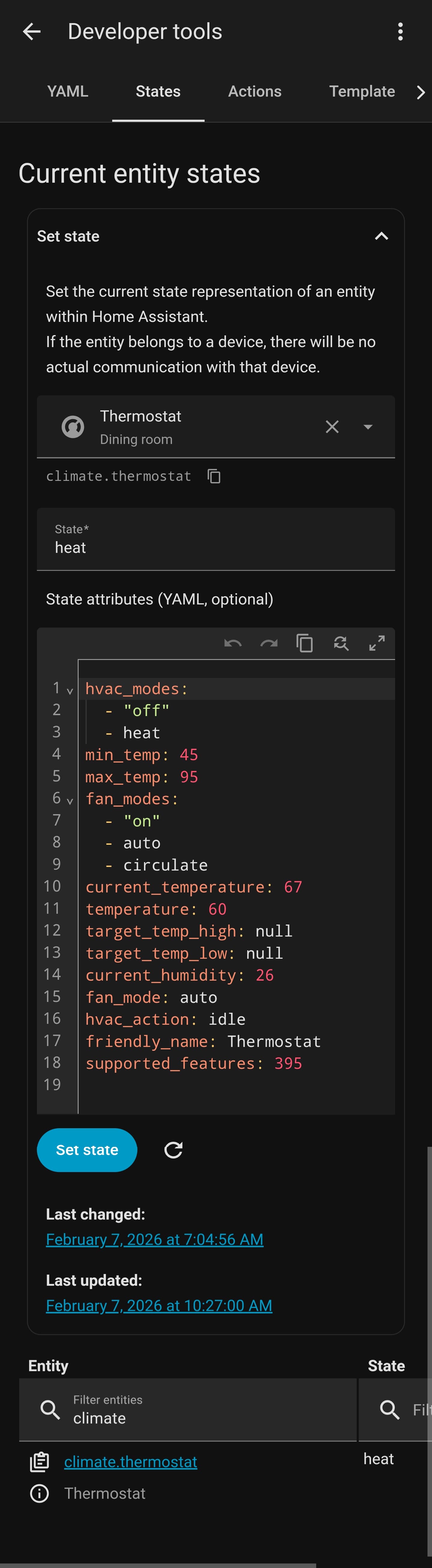 I did not want to try your state version, because it’s YAML I do not understand and suspect may be wrong, and ultimately would rather use UI anyway. My reason in sharing YAML was to help other people see what exactly UI had made for me without needing screenshots of the multiple different UI screens. I suspect it may be wrong because ground is a floor, but you labeled it as id. And I don’t think climate.target_temperature exists per developer tools, either as a state or an attribute. I do see attribute climate.temperature in my developer tools, but I know attributes often can’t be called the same way as states so I don’t really know if that’s equivalent in the context of automation.