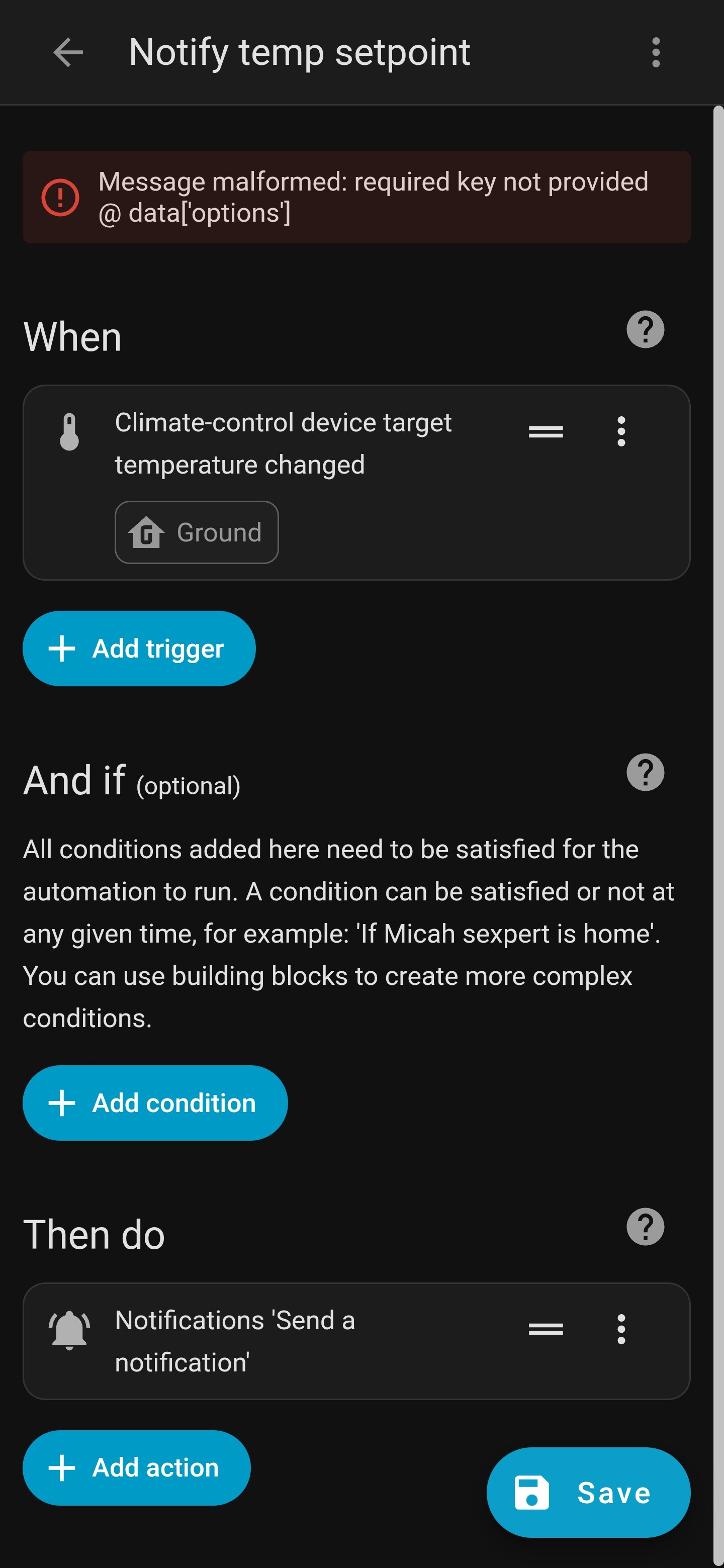 Any suggestions to fix error Message malformed: required key not provided @ data['options'] for this automation created with the new labs purpose-specific trigger for climate setpoint changed? I tried both with an area and with the climate thermostat entity, same error with both.