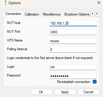 Work pick it up with the IP address either. I’ve tried on a Windows 10 laptop which the UPS was connected to via USB to confirm connection, the NUT Client doesn’t pick up the UPS on that either. Most likely the NUT Client configuration is incorrect but not sure.