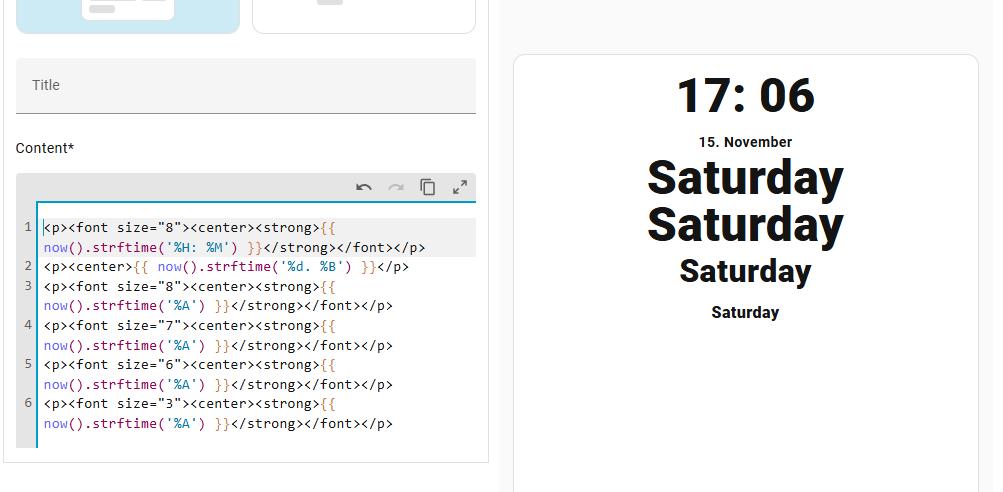 <font size='10'>{{ now().strftime('%H:%M') }}