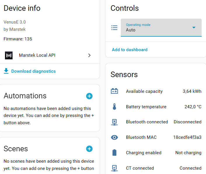 Most of the sensors are Unknown or incorrect for me. Battery % is correct. It says charging while discharging. Remaining capacity is also incorrect. Really pleased with the development but something is going wrong for me. The FW of the Marstek V3 is V139