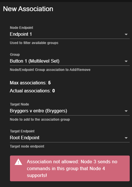 I’m not entirely sure how the association should be setup, but I think I need an association from switch one Endpoint 1 Button 1 (Multilevel set) to switch 2 “Root endpoint”, but when I select group button 1 multilevel set for switch 1 and i select switch 2 as target node, I get an error in the UI “Association not allowed: Node 3 sends no commands in this group that Node 4 supports!”.