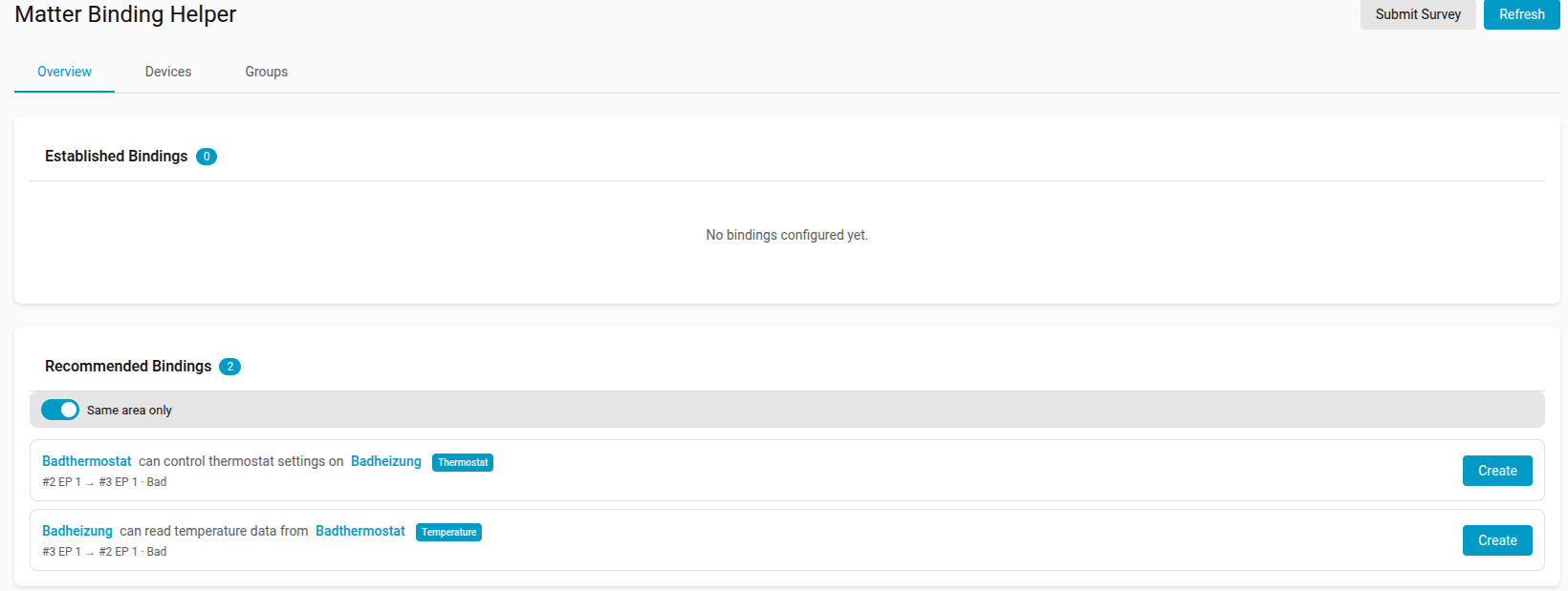 I am still setting up while renovating and currently I have 3 matter over threads devices all in the same room (bathroom). These are all Eve devices, a window sensor, a room thermostat and the radiator thermostat. As it seems I can’t (yet?) get matter binding going natively, I have installed the Matter Binding Helper integration through HACS.