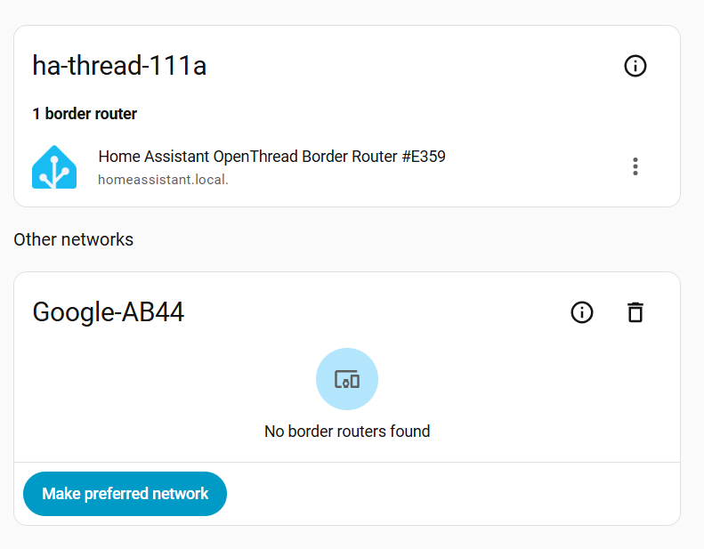 The “Google-AB44” was at one point known by HA and somehow it got the thread credentials (shown by the (i)), but now it does not see any mDNS advertisements from the router (that’s why is shows “No border routers found”). Was this the Nest Connect Hub or is this the Google Stream 4K