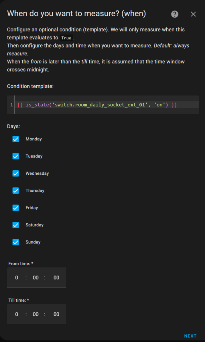 For the future I could consider creating a template sensor which I pass to MeasureIT as the template condition, and if I want to adjust I would re-configure the template sensor.