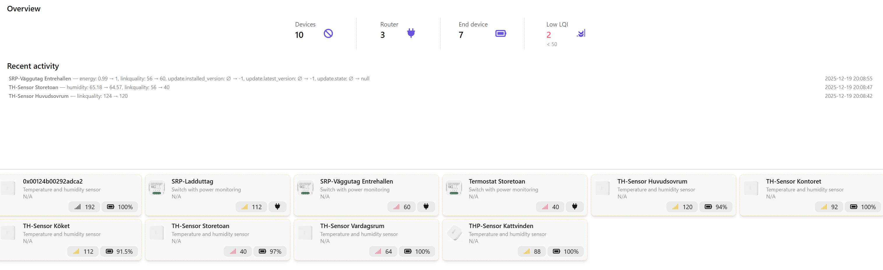 Conversely, the server power monitoring plug right next to my coordinator is showing an LQI of 87, which makes no sense. Once Iâm done monitoring the 20dBm power, I want to lower it back down to 5 and see if it has any effect on either device.