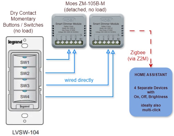 I want to use the Moes ZM-105B-M zigbee modules only as a converter between 4 momentary buttons (dry contact switches) and Home Assistant … no load will be connected to the switches or modules.