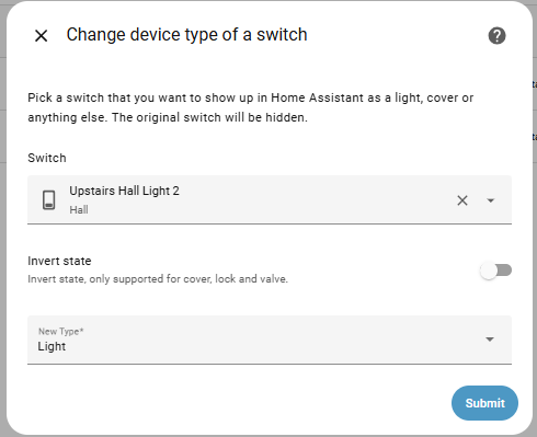 First the problem. My lights are controlled by Shelly smart relays so are switch.xxxxx not light.xxxx control entities. Consequently as the blueprint looks for entity names in the light domain I can’t pick the right control entity.