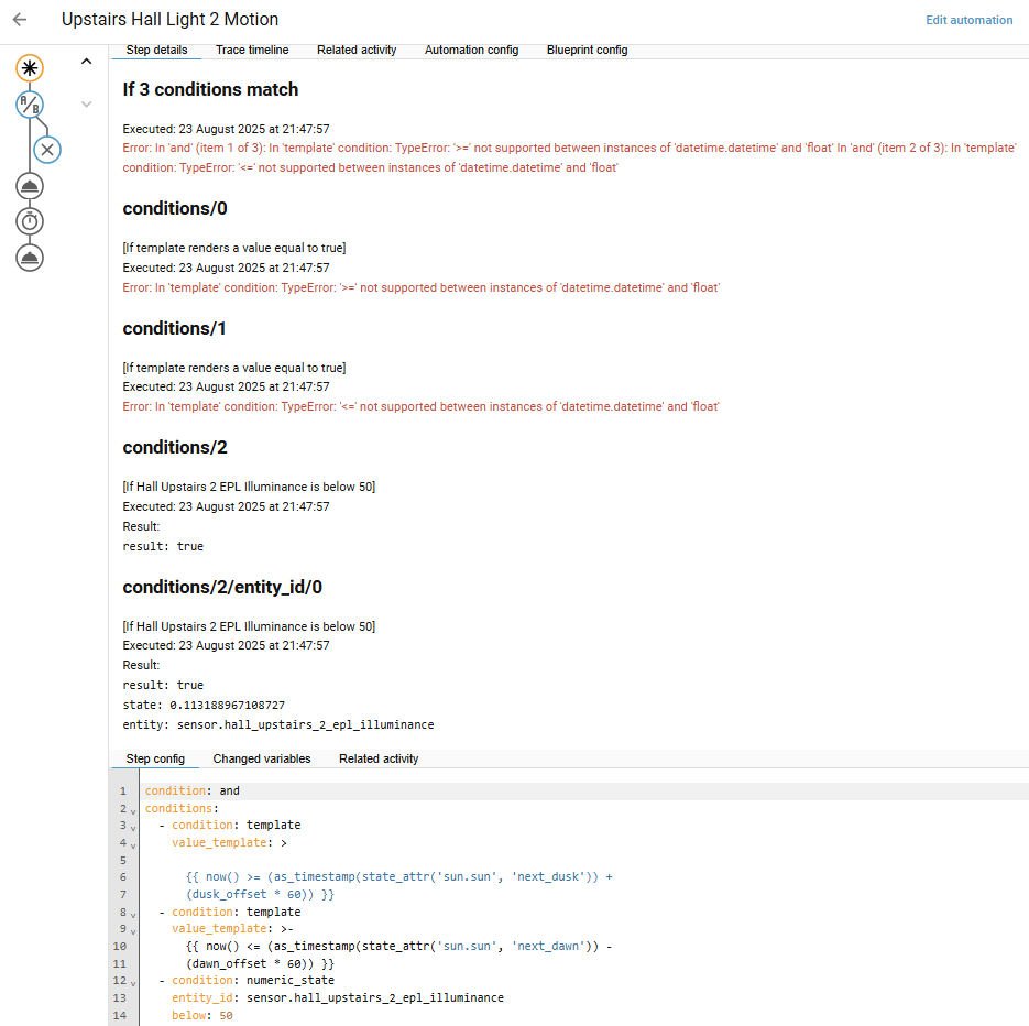 Now the bug. When the automation is triggered by the motion sensor and I look at the automation trace I can see that the automation fails with what appear to be data type conversion errors: