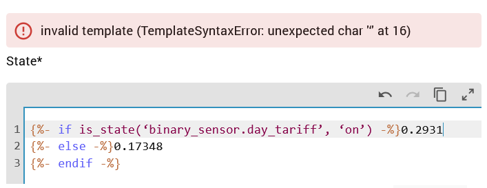 As Chris has pointed out above, you are missing quotes around the entity ID and state args in your is_state() function. Without those quotes Jinja interprets binary_sensor.day_tariff as a variable instead of a string, and you haven’t defined a value for that variable… which will cause an error. IIRC, on will be treated as a boolean, but the state arg expects a string, so that will cause a different error.