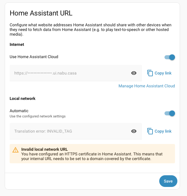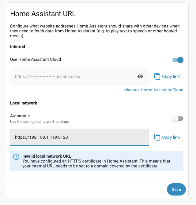 Invalid local network URL - You have configured an HTTPS certificate in Home Assistant. This means that your internal URL needs to be set to a domain covered by the certificate.