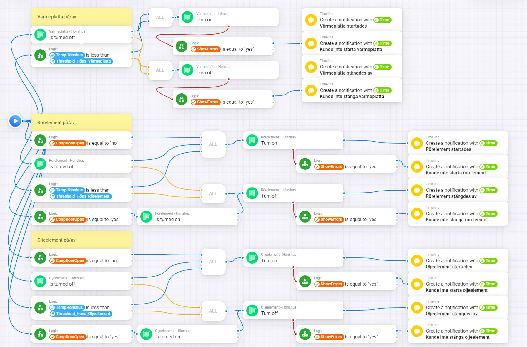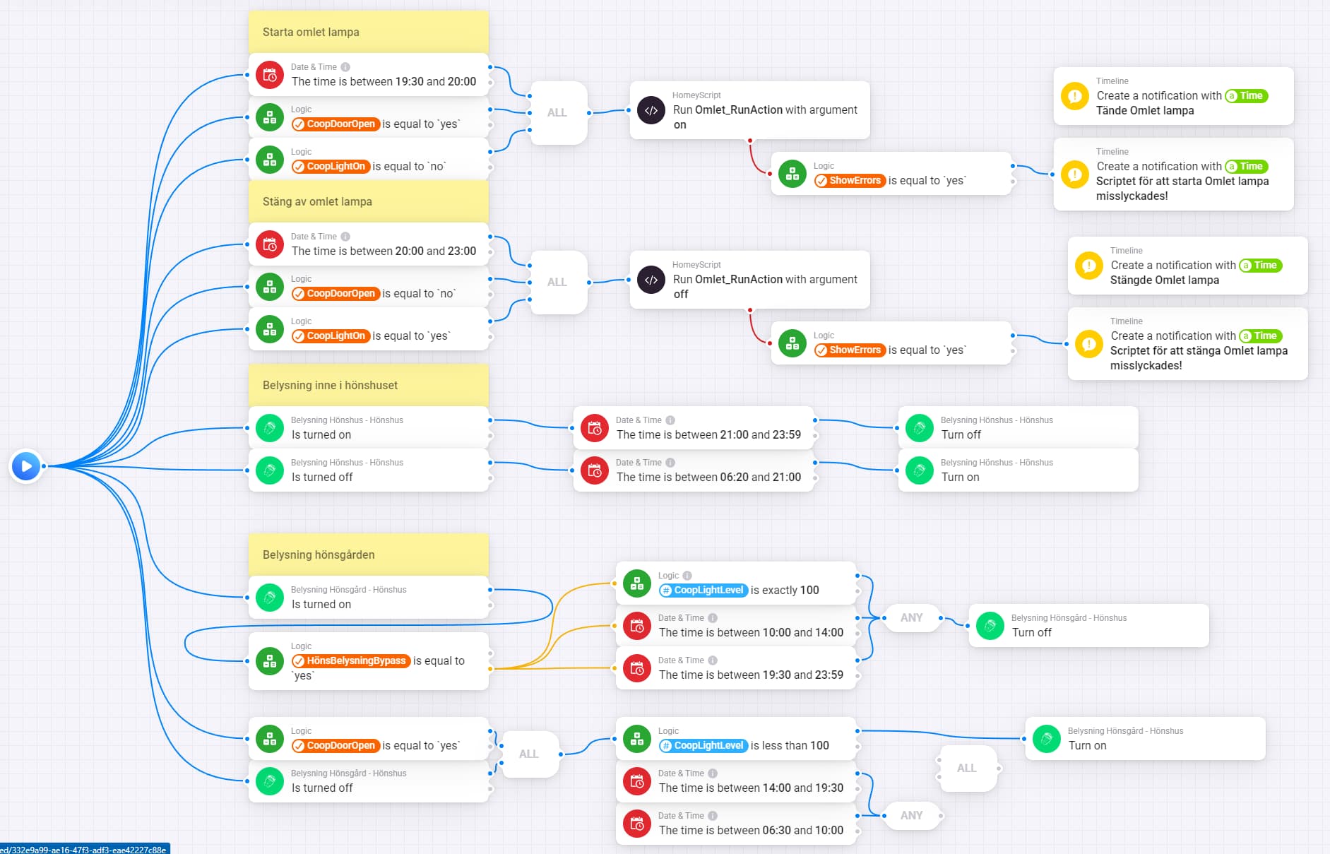 One example is the full control of everything inside and outside my chicken coop which currently follow this simple pseudo code: (What I currently have going in Homey)