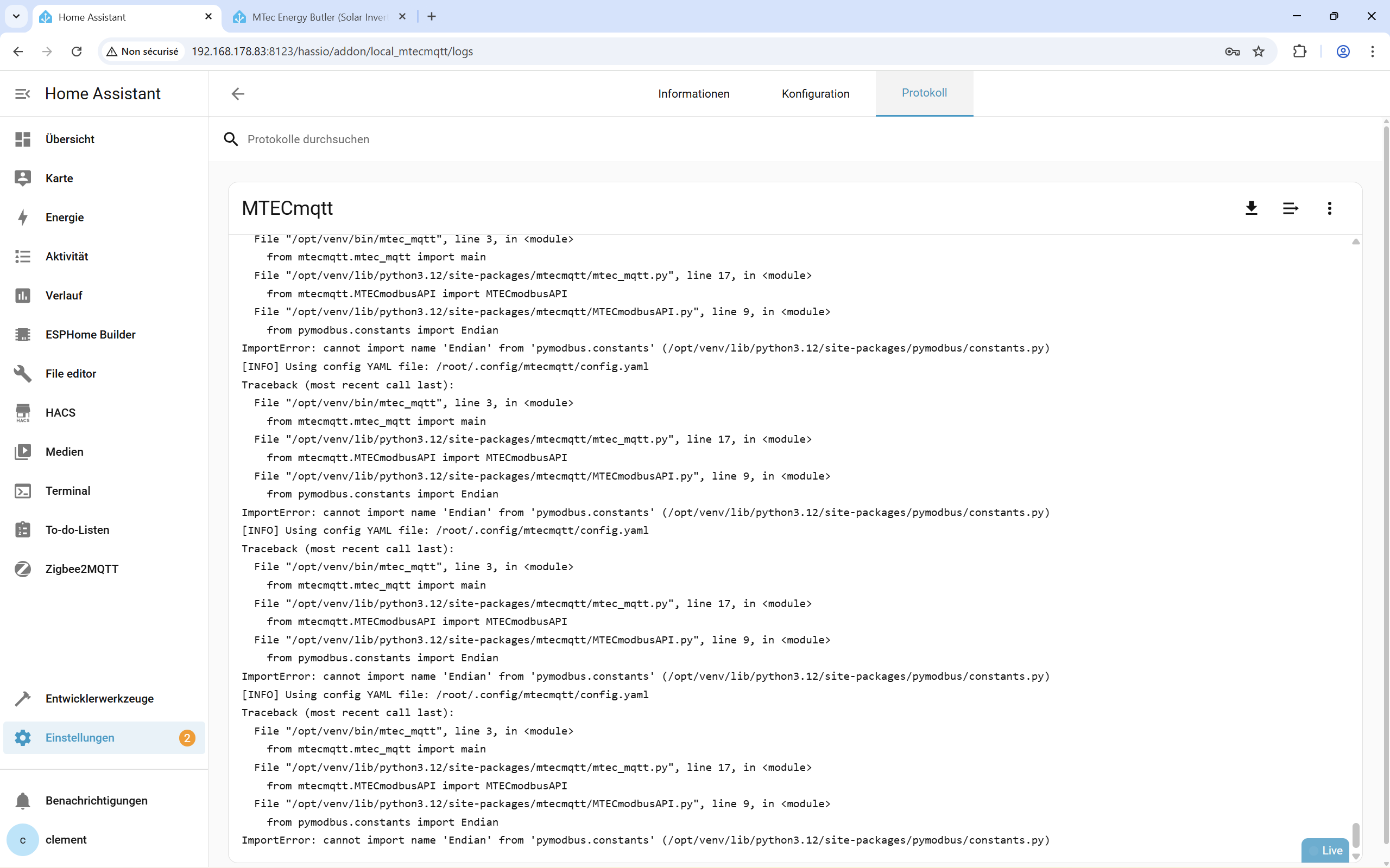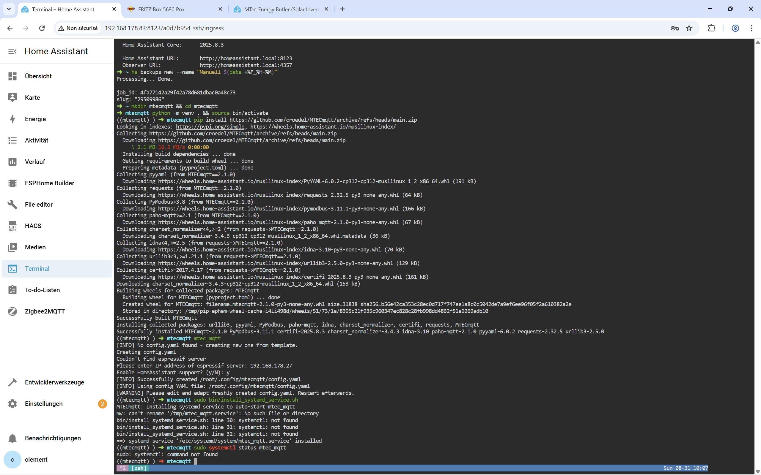 Bin nach Anleitung ( GitHub - croedel/MTECmqtt: Enables to read data from M-TEC Energybutler and write them to a MQTT broker.) vorgegangen.
