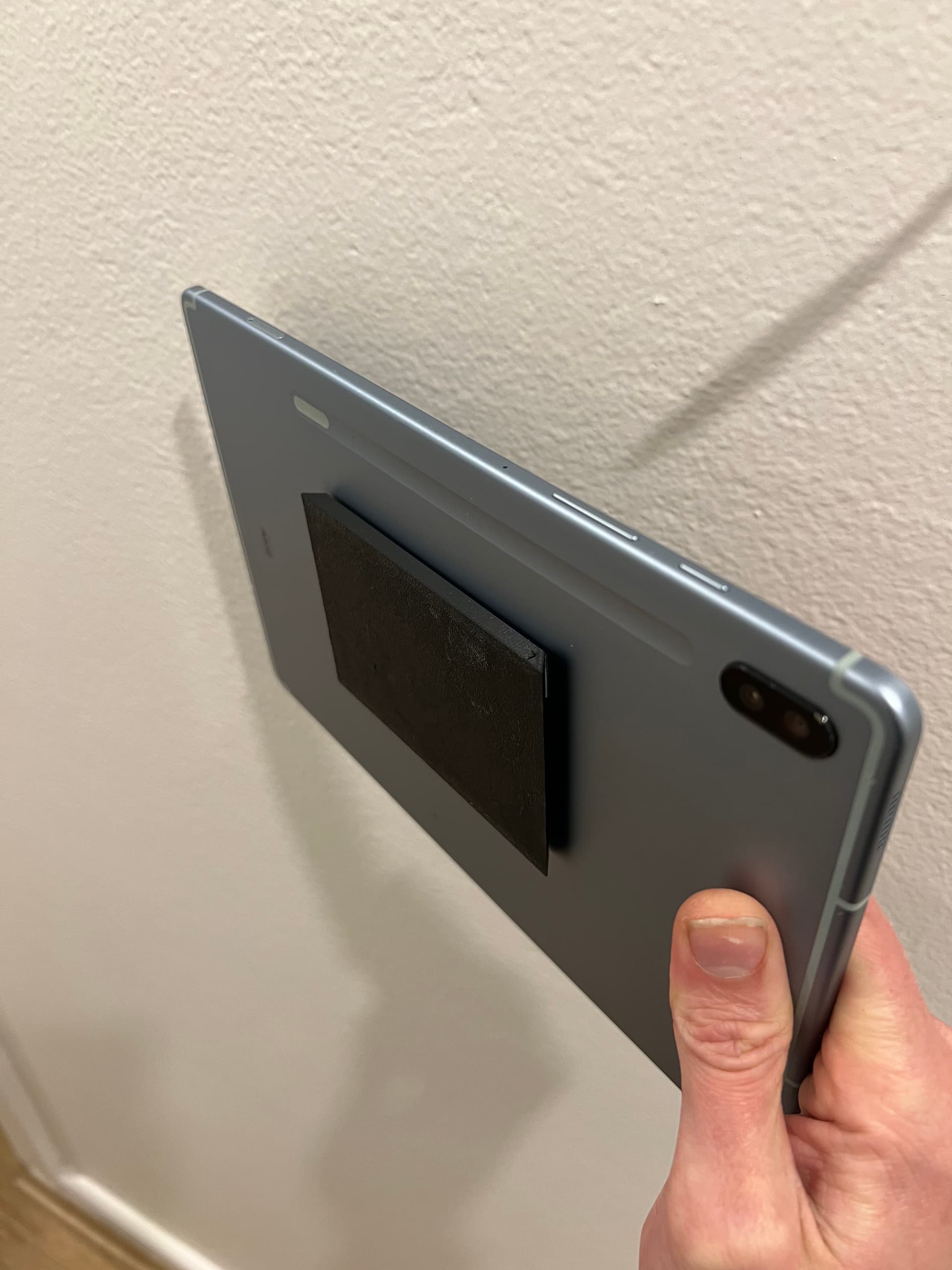The mounting design uses a sliding vertical cleat design to allow the tablet to be easily removed from the wall when needed. Simply slide the tablet upward and out to use it elsewhere. The cleat attaches to the rear of any tablet with a secure mounting tape. But don’t cheap out on the tape, it’s the only thing holding the tablet to the mount!!