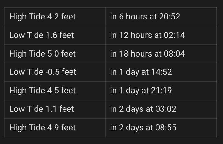 Next I found Flight-Lab’s HA_Noaa_Tides integration, which I really like because it has a lot features (including ones I’ve been thinking about). I proposed a pull request that adds the current tide level to the tide_predictions sensor, based on the previous and next tide levels and the current tide factor.