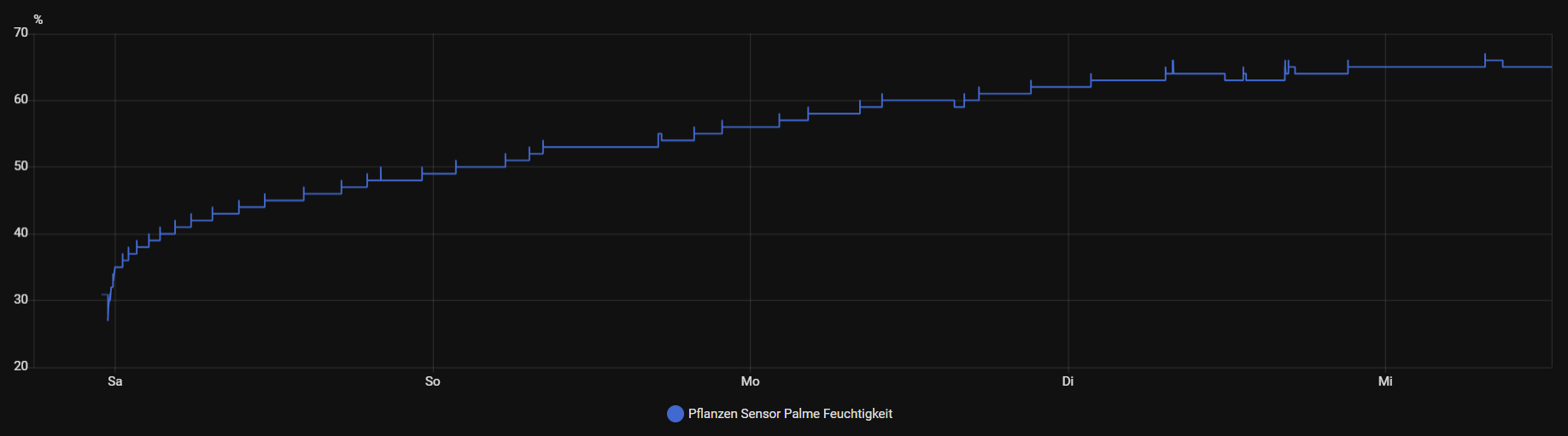Now this is what I like to see! Low values for dry soil, close to 100% for freshly-watered soil, and then a steady decline over the days (with the day-to-day drop being greater than the intra-day temperature-induced spikes).