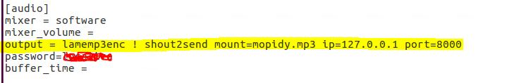 Uncomment the AUDIO Section and change OUTPUT to “output = lamemp3enc ! shout2send mount=mopidy.mp3 ip=127.0.0.1 port=8000”