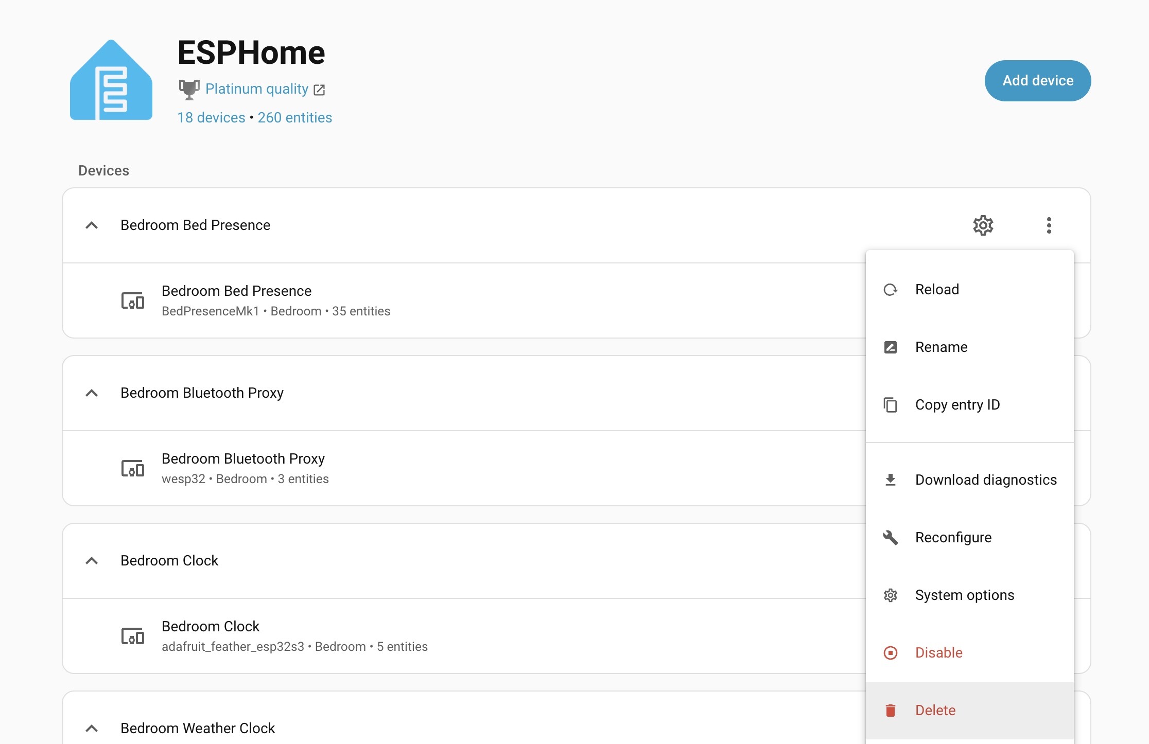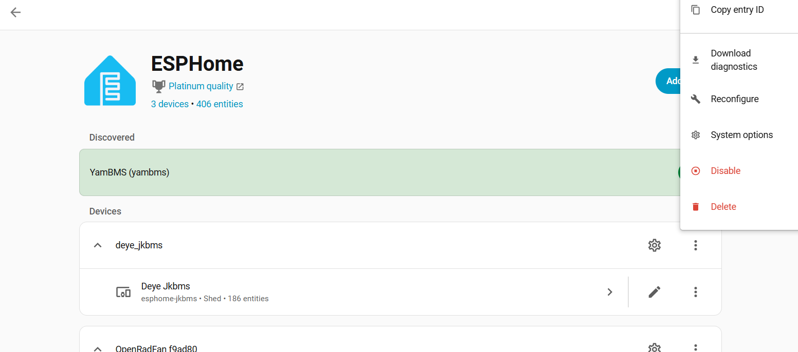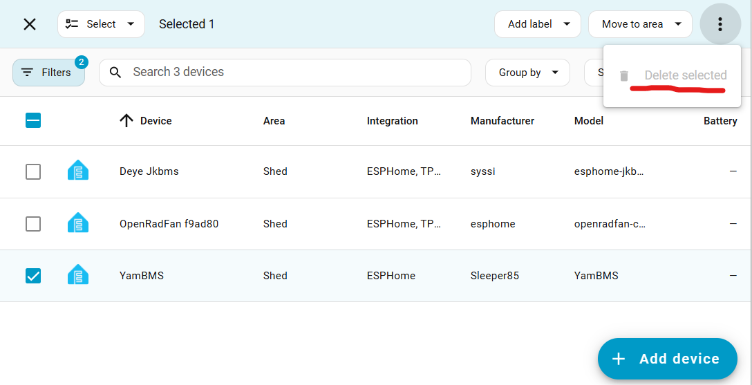 I am trying to delete an ESPHome device, but the Delete option is greyed out