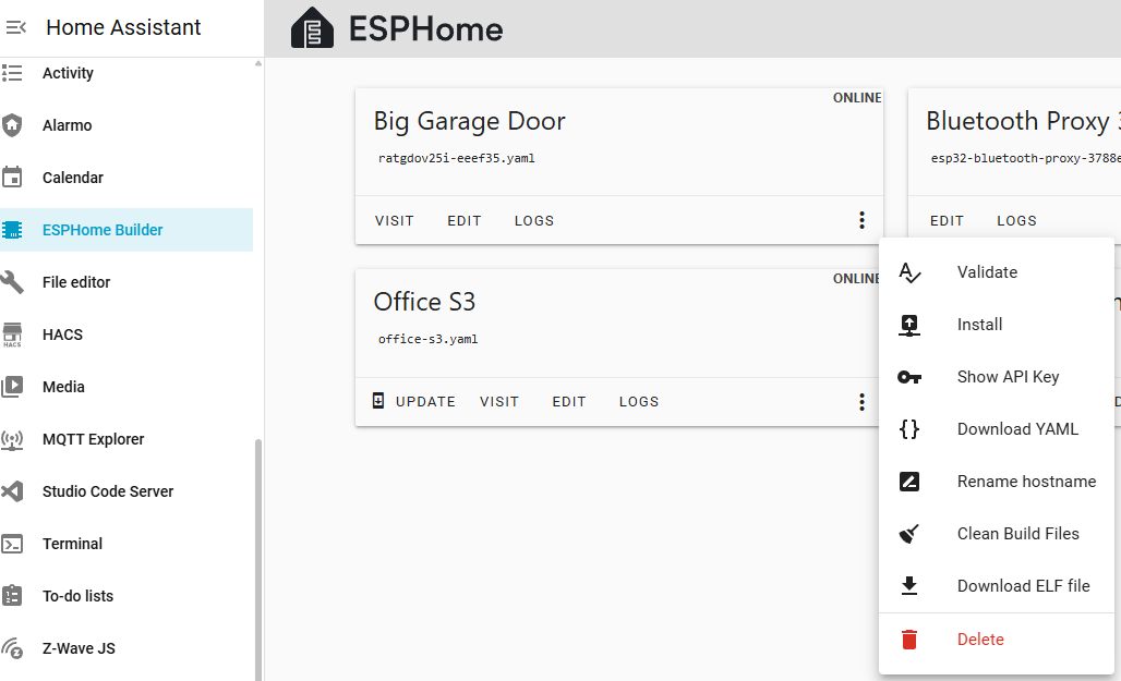 I went into the ESPHome main item, and it listed the devices within it and I could then click the 3 dots there