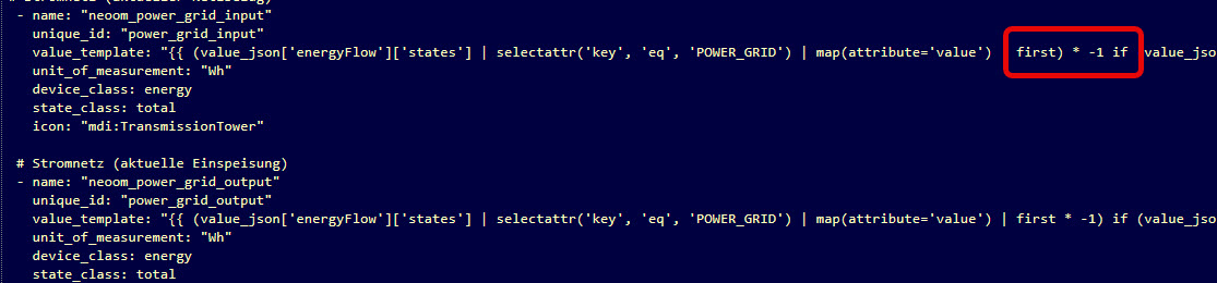 value_template: "{{ (value_json['energyFlow']['states'] | selectattr('key', 'eq', 'POWER_GRID') | map(attribute='value') | first) * -1 if (value_json['energyFlow']['states'] | selectattr('key', 'eq', 'POWER_GRID') | map(attribute='value') | first) < 0 else (value_json['energyFlow']['states'] | selectattr('key', 'eq', 'POWER_GRID') | map(attribute='value') | first) }}"