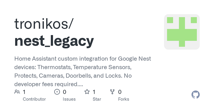 The official Home Assistant Nest integration uses Google’s Smart Device Management (SDM) API, which has a limited set of supported devices and requires a one-time $5 fee. This Nest Legacy integration uses the same unofficial API that the Nest mobile and web apps use, offering several key advantages.
