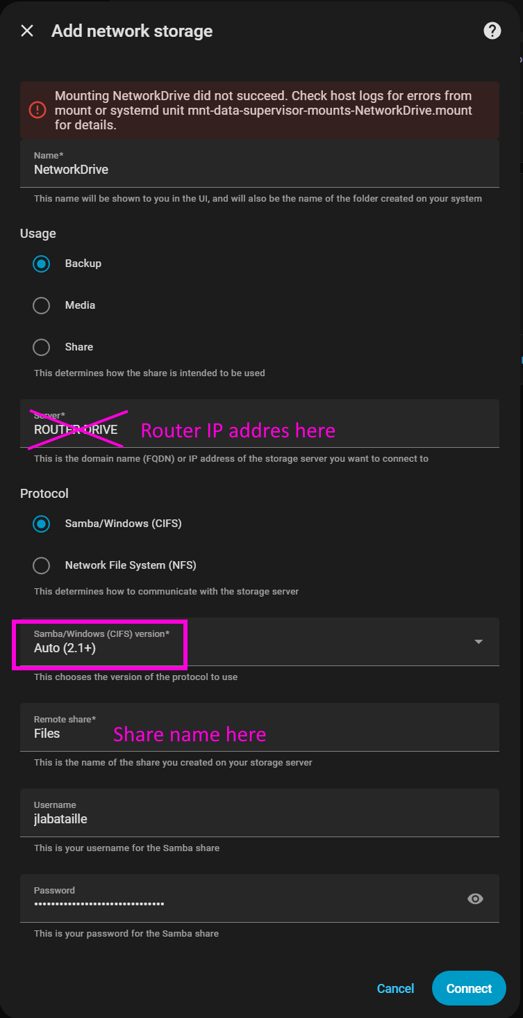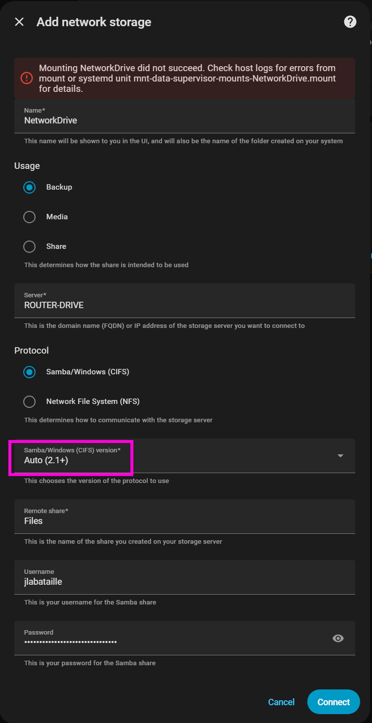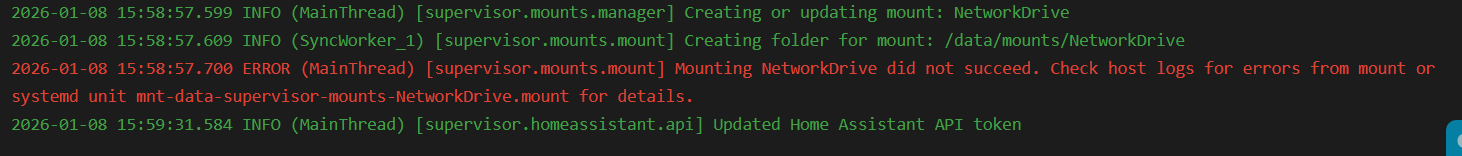 2026-01-10 10:16:02.682 homeassistant systemd[1]: mnt-data-supervisor-mounts-NetworkBackup.mount: Mount process exited, code=exited, status=1/FAILURE