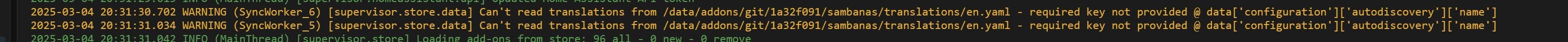 My Home Assistant runs on a Raspberry Pi 3 with HAOS. Everything is updated to the last version. I havenāt been able to update Samba NAS from 12.2.0-nas2 to 12.3.2-nas, since I keep getting this error: