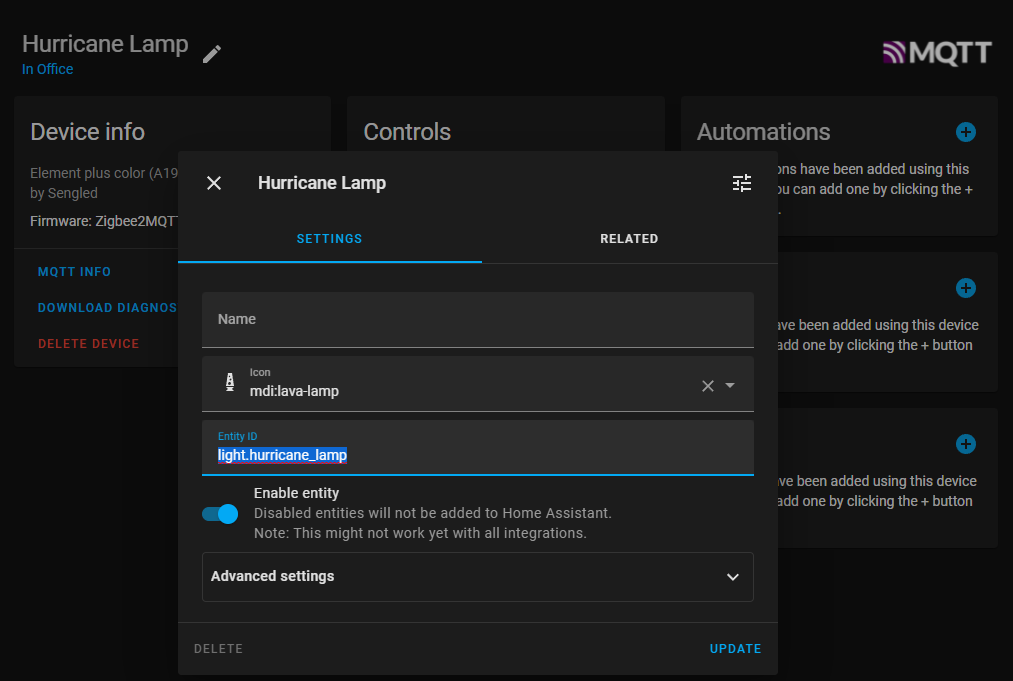 This fixture has a Sengled bulb - when I add it Z2MQTT usually brings it in with an entity ID something like ‘light.rgb_01234.’ The name doesn’t really matter - becasue I IMMEDIATELY rename it to light.hurricane_lamp and I’ve done it all 6 times ive replaced this particular bulb.