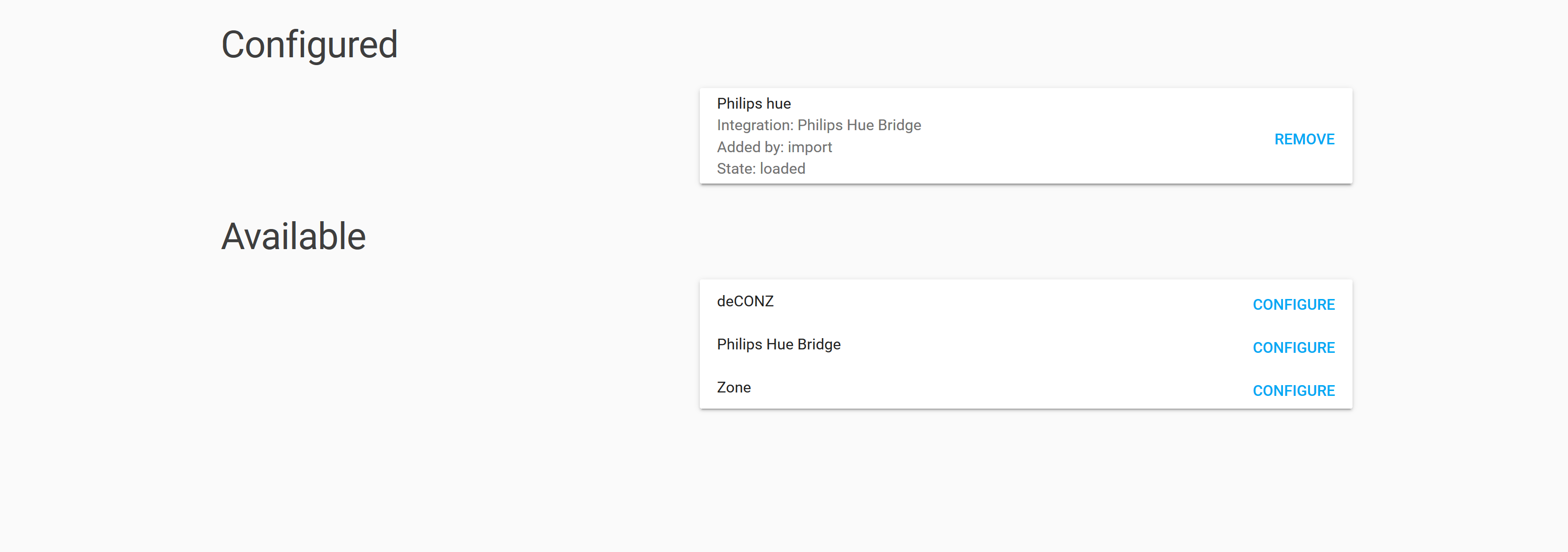 I’m unclear on whether the configured “Philips hue” and the unconfigured “Philips Hue Bridge” are the same thing or not, and whether I should be removing the former and configuring the latter. I’m also using zones, so I’m unclear on what the unconfigured “Zone” is for. And I didn’t even know what deCONZ was until this message appeared, so I’m pretty sure I haven’t added any new Zigbee devices.