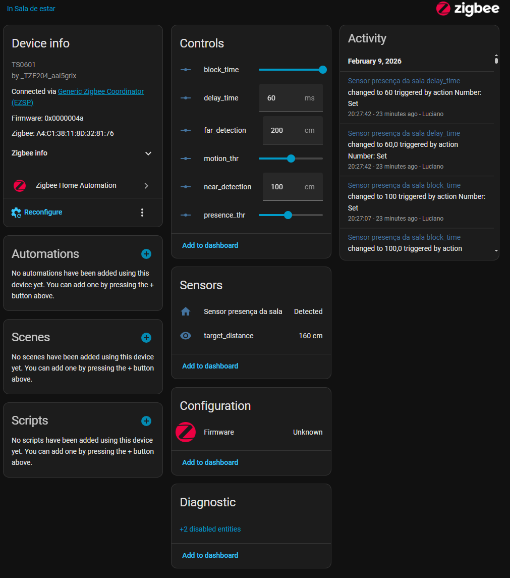 I have this Wenzhi MTD285-ZB ZigBee 24GHz Radar device and wanted to integrate using ZHA (Zigbee Home Automation). I have a SLZB-06M and the sensor is discovered normally, but only shows the Firmware, LQI and RSSI entities. Unfortunately, I did not find any quirks available for this sensor. I have renamed a couple of pre-existing quirks for presence sensors to see if the entities match and also tried using ChatGPT to create a quirk but could not find or make it work so far.