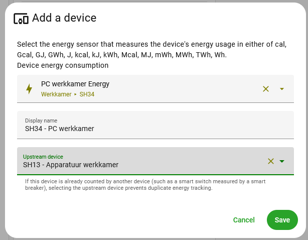 However, I found out that a specific Shelly device that I have measuring my PC energy usage (SH34 in the graph) was not yet given its proper upstream device: the Shelly that measures the energy usages for the whole of my office room (SH13).