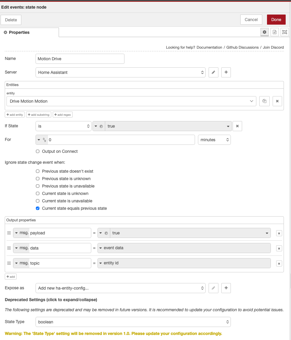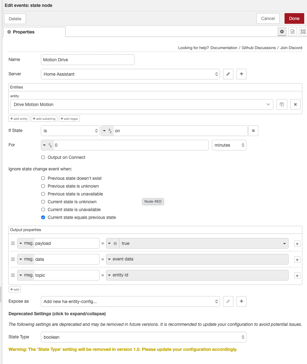 So apparently I can no longer use Node Red to control lighting where a motion sensor returns True or False for motion detection.