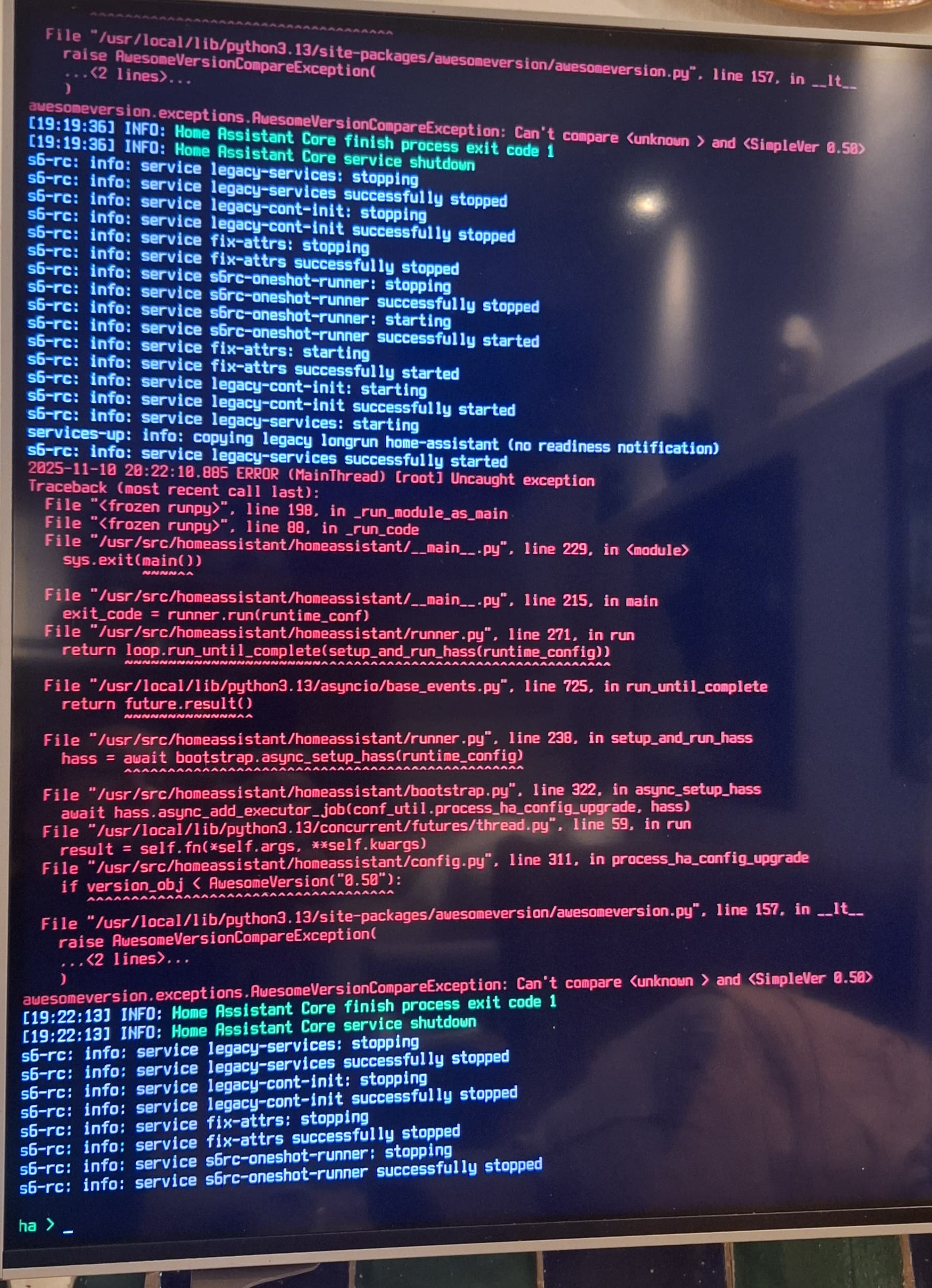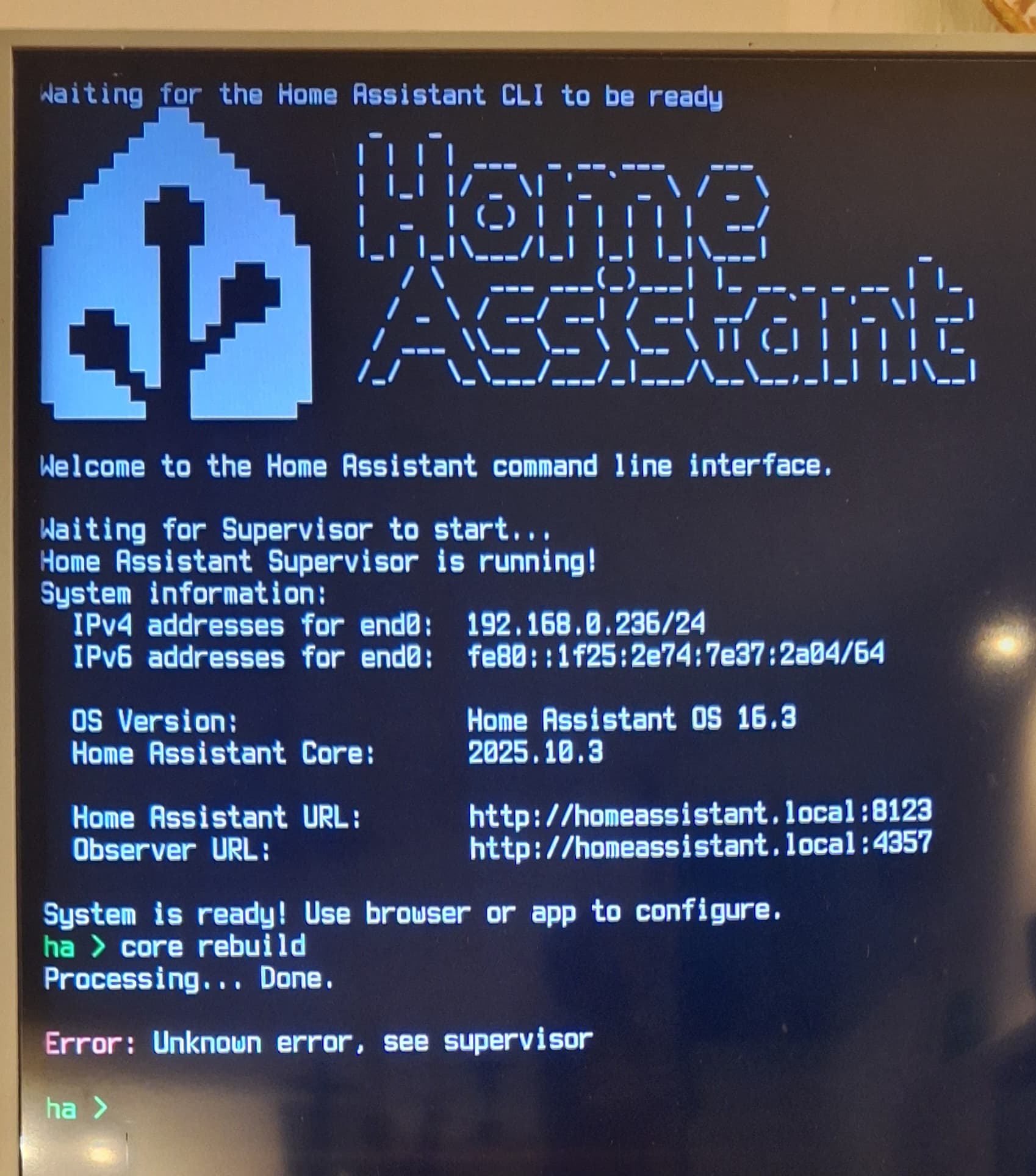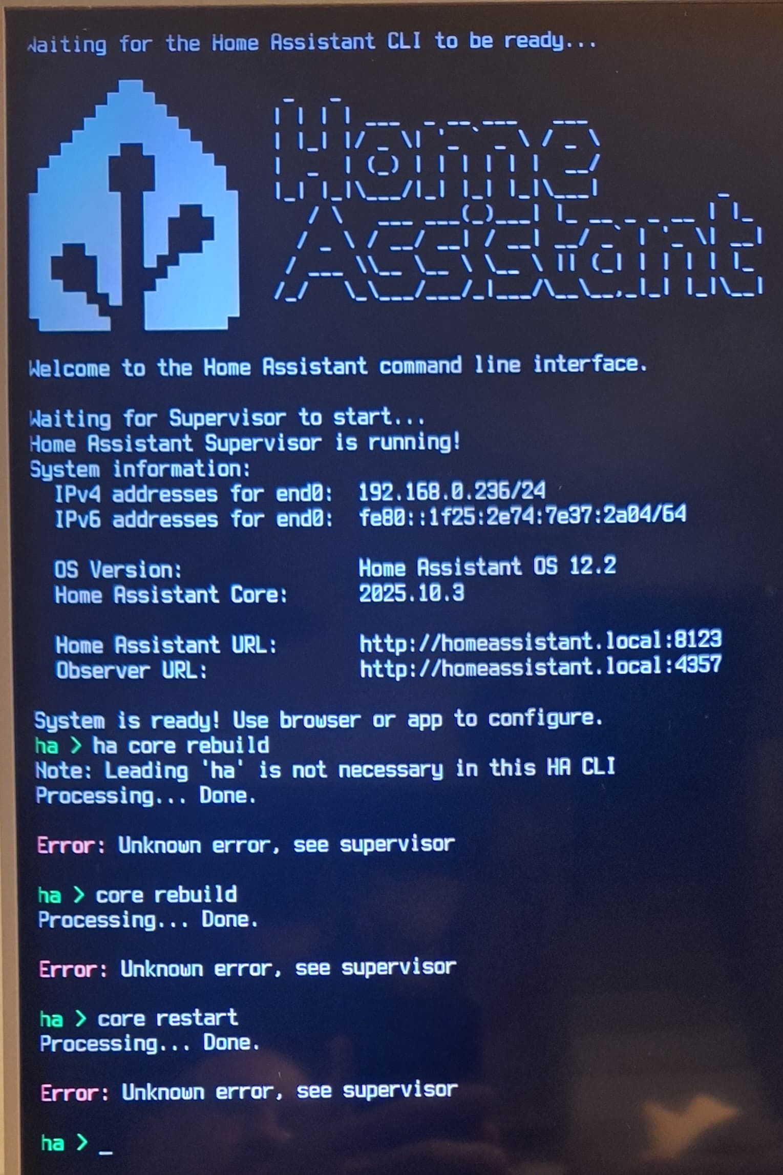 Thank you very much and very clear. So I did this and seem to have made things worse! I got a response of “unknown error” from HA CLI and on host reboot I cannot even get into the CLI. I attach the CLI responses. My current screen after rebooting and going through a series of initialization messages [ 5.nnnn] is “Waiting for the HA CLI assistant to be ready…” then "[WARN] Home Assistant CLI not starting! Jump into emergency console…