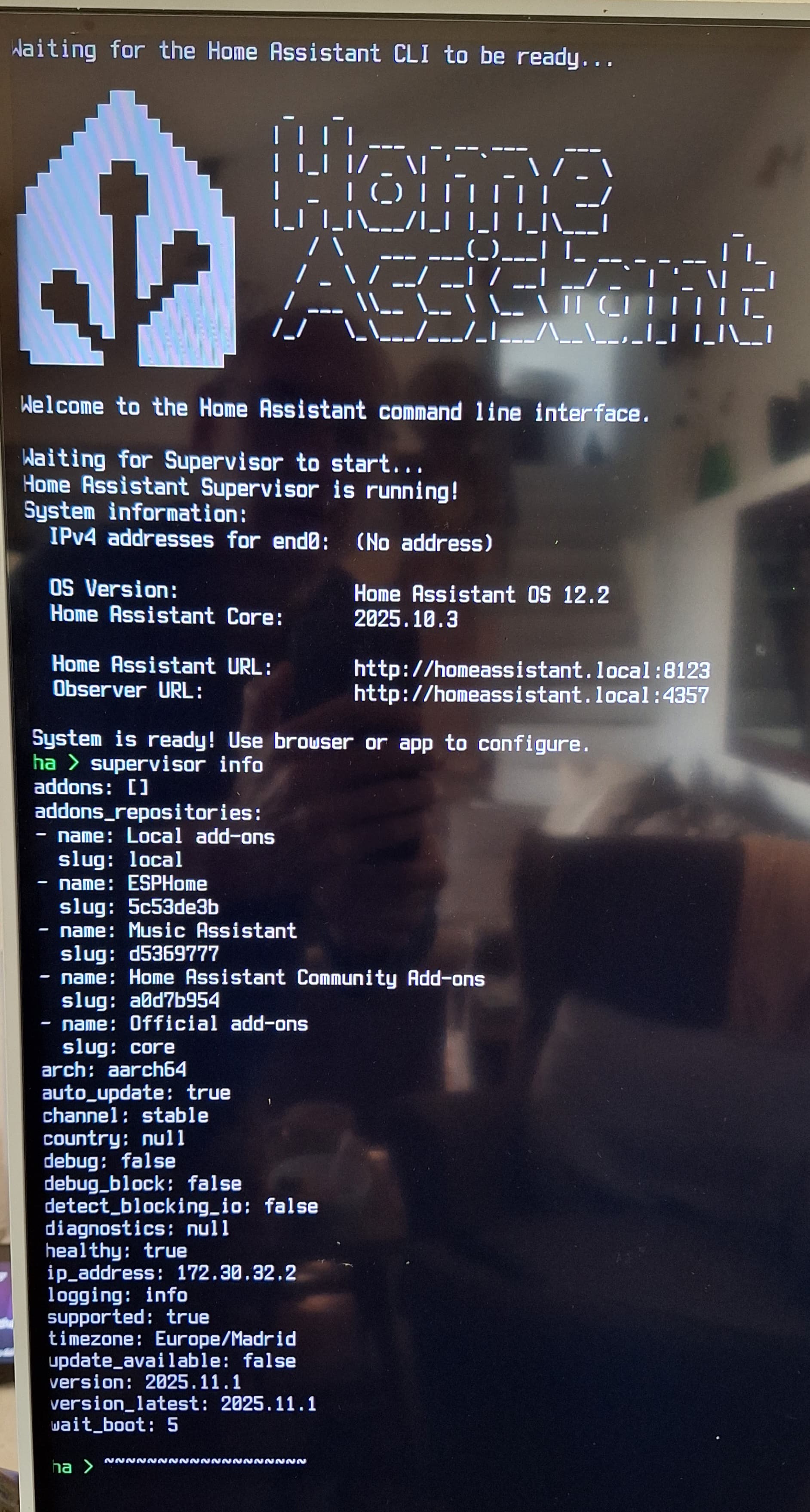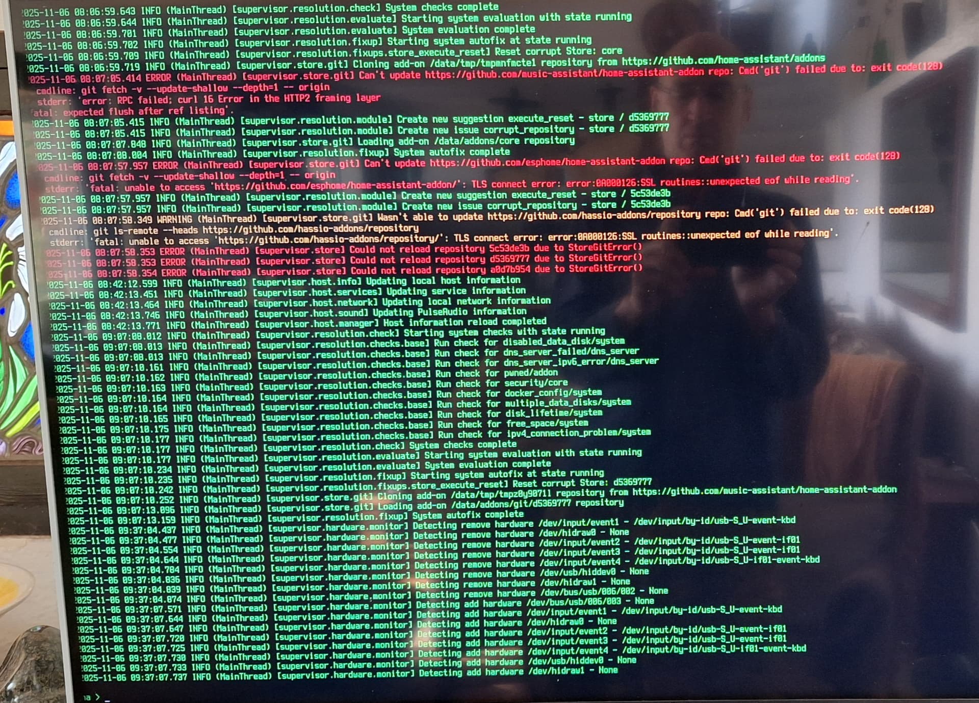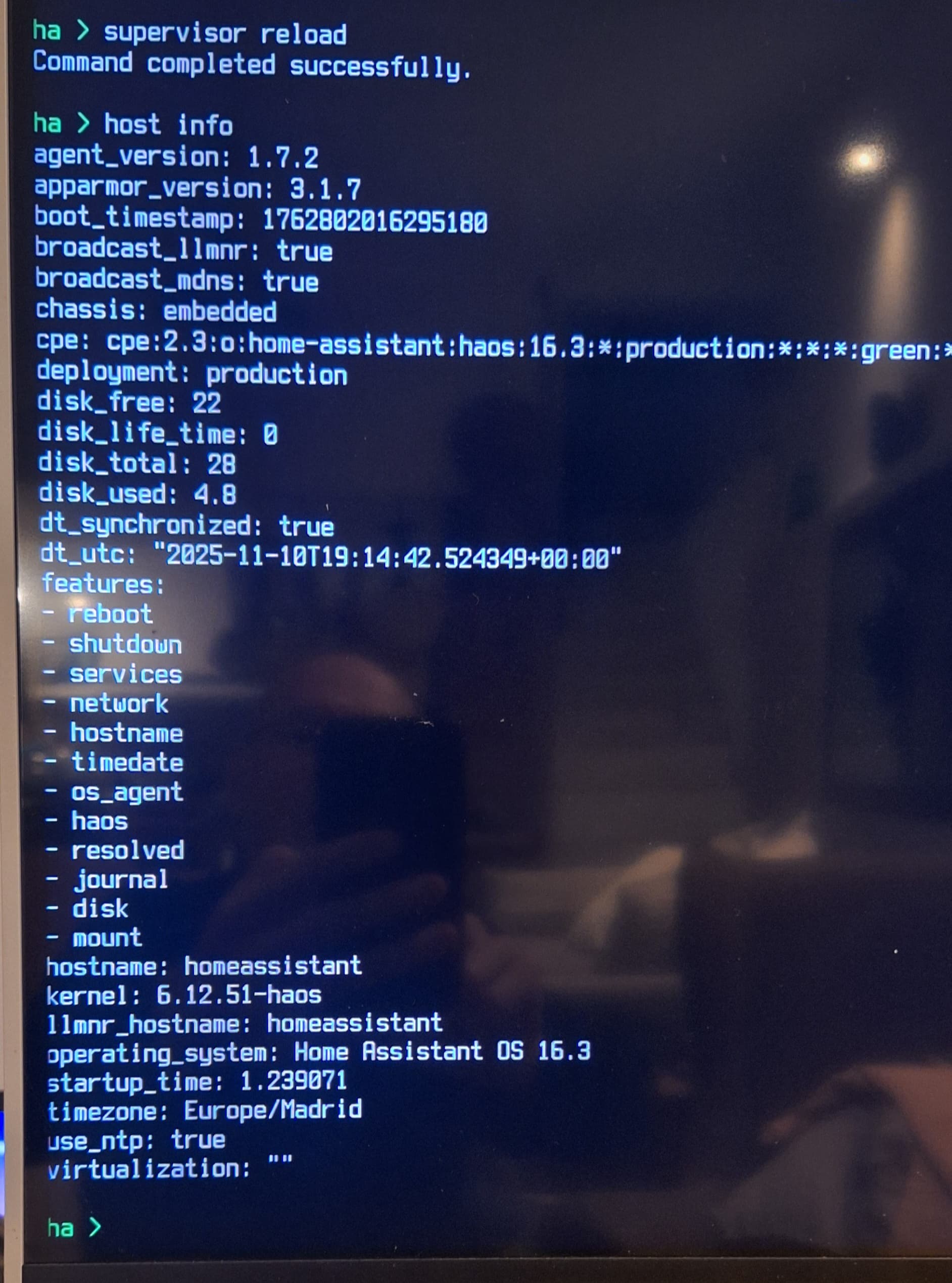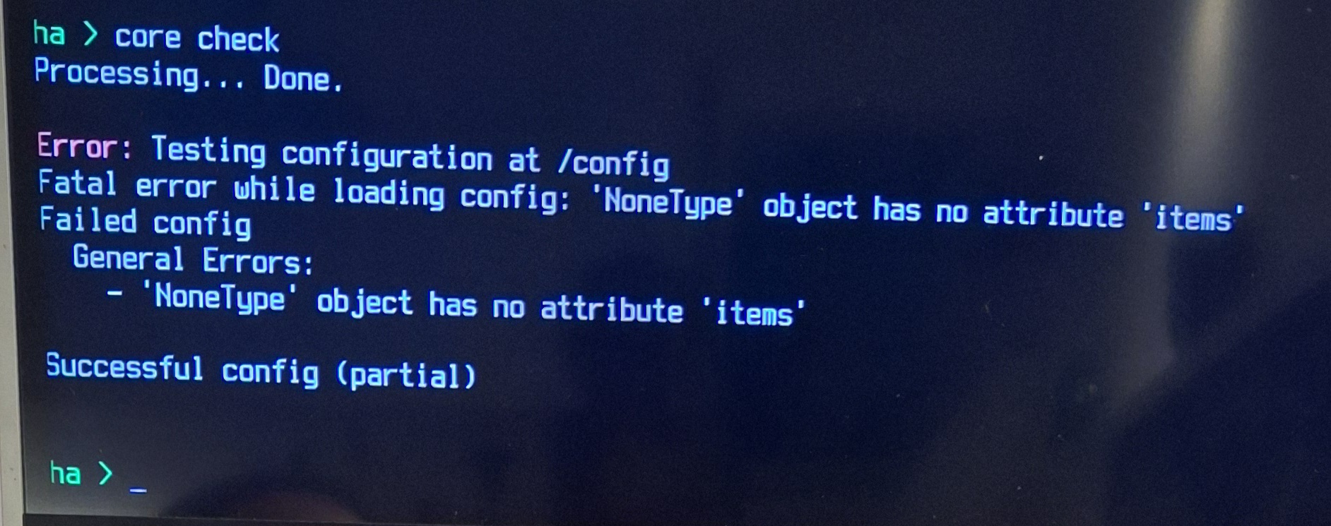 Thank you very much and very clear. So I did this and seem to have made things worse! I got a response of “unknown error” from HA CLI and on host reboot I cannot even get into the CLI. I attach the CLI responses. My current screen after rebooting and going through a series of initialization messages [ 5.nnnn] is “Waiting for the HA CLI assistant to be ready…” then "[WARN] Home Assistant CLI not starting! Jump into emergency console…