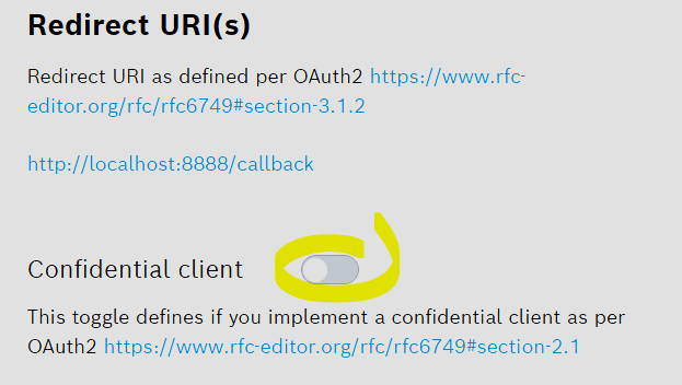 Create application in Bosch Data Act Portal (Login URL = Bosch auth endpoint, Redirect URI = http://localhost:8888/callback)