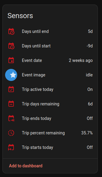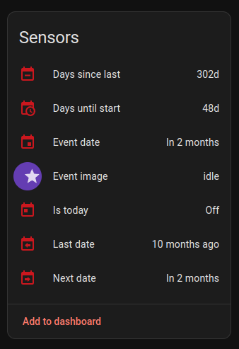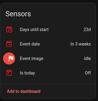 Each event creates an image entity - either your custom picture or an auto-generated icon. Display it on your dashboard alongside the countdown for a visual reminder.