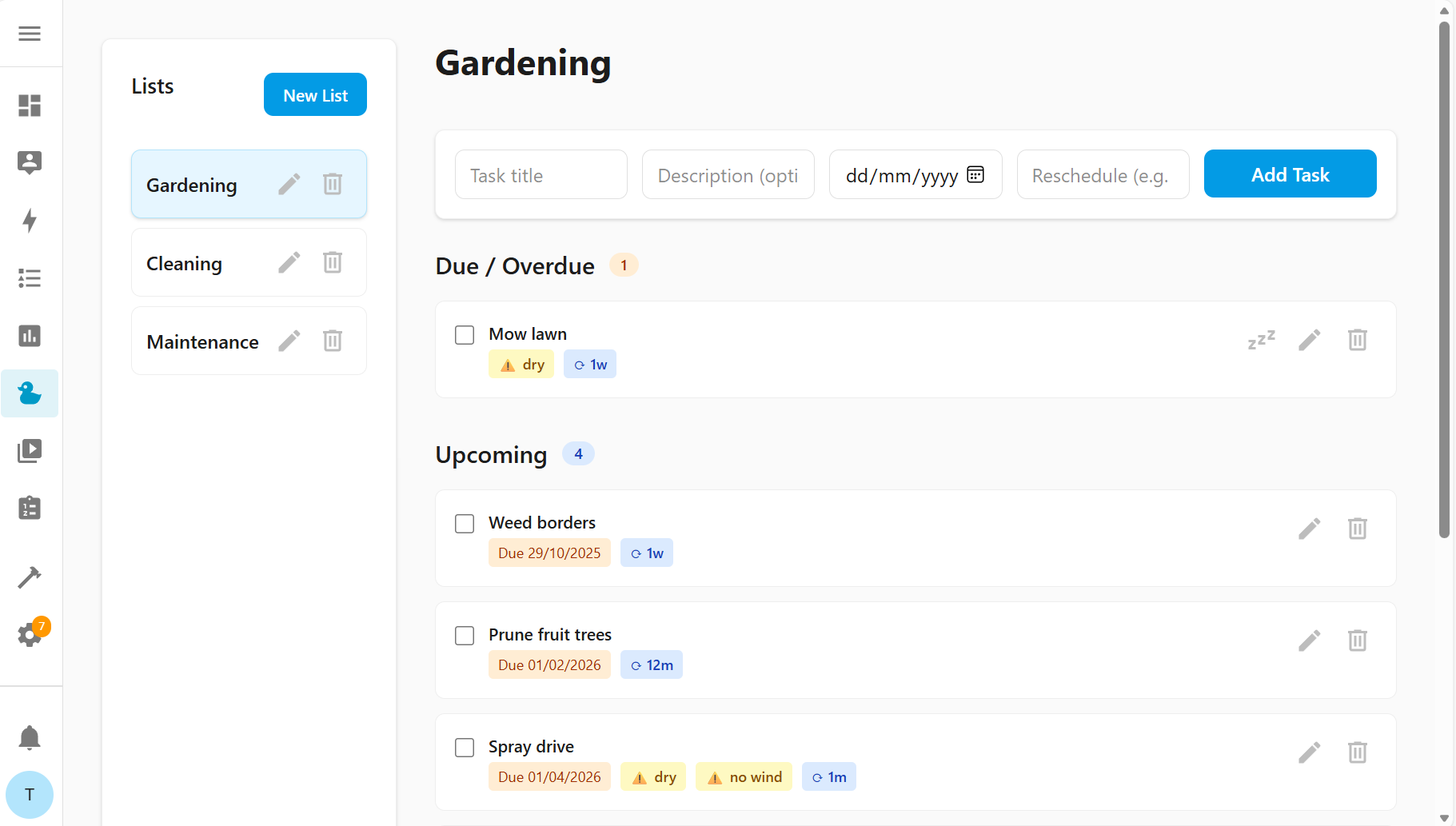 I’ve created a new (yet another!) addon and custom integration for tracking recuring tasks - Home Upkeep. It’s specifically intended for my household and gardening chores, and home maintenance tasks. Tasks are organized into lists and can be managed as standard Home Assistant Todo entities as well as though a the custom UI.
