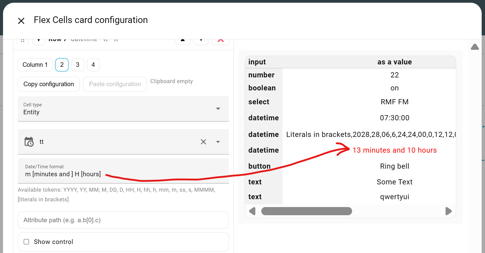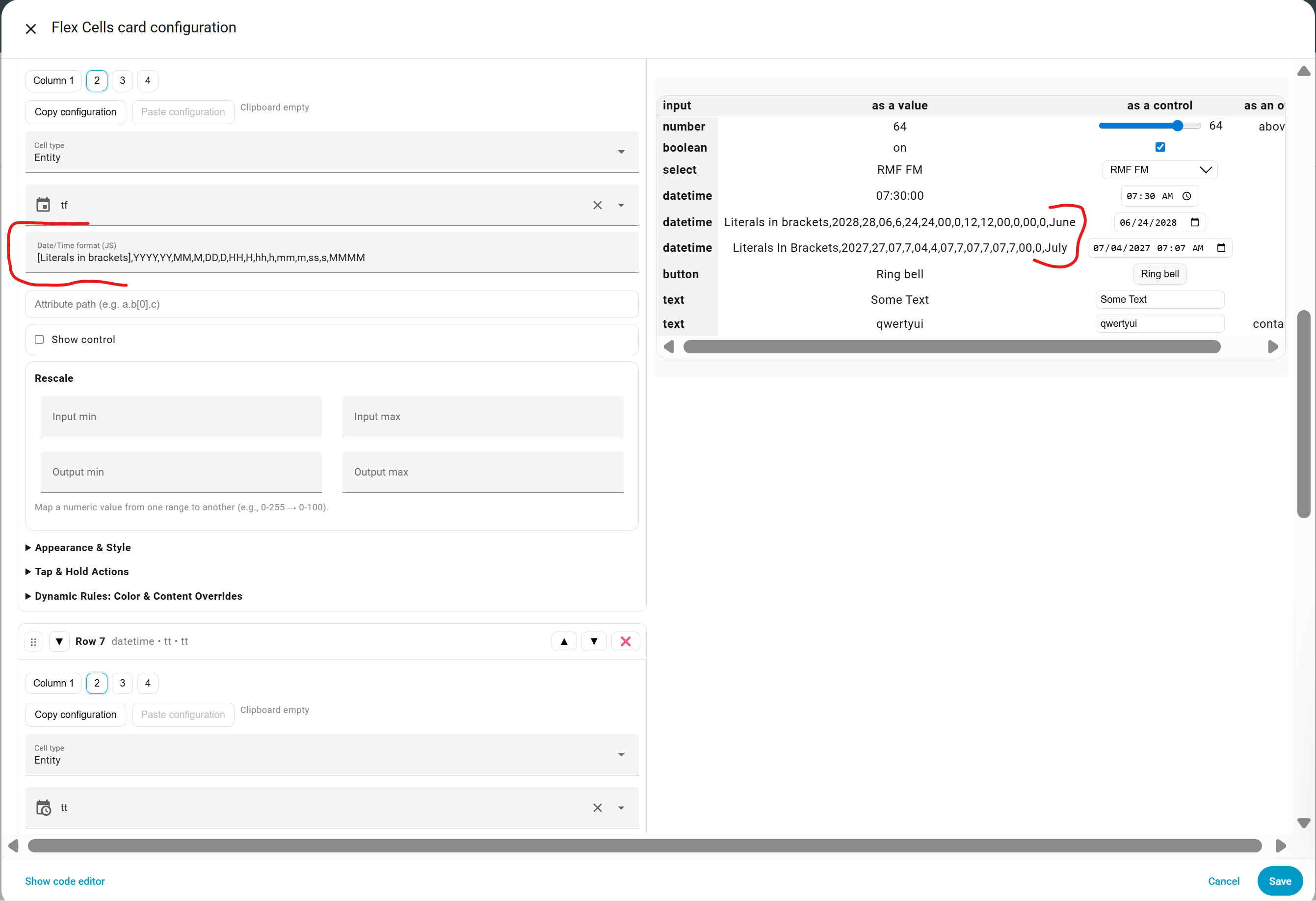 Regarding input_datetime formatting, that’s a very good idea. I’ve already prepared a preliminary version that will offer the tokens visible in the screenshot. The MMMM token will be displayed in the language selected in the HA settings.