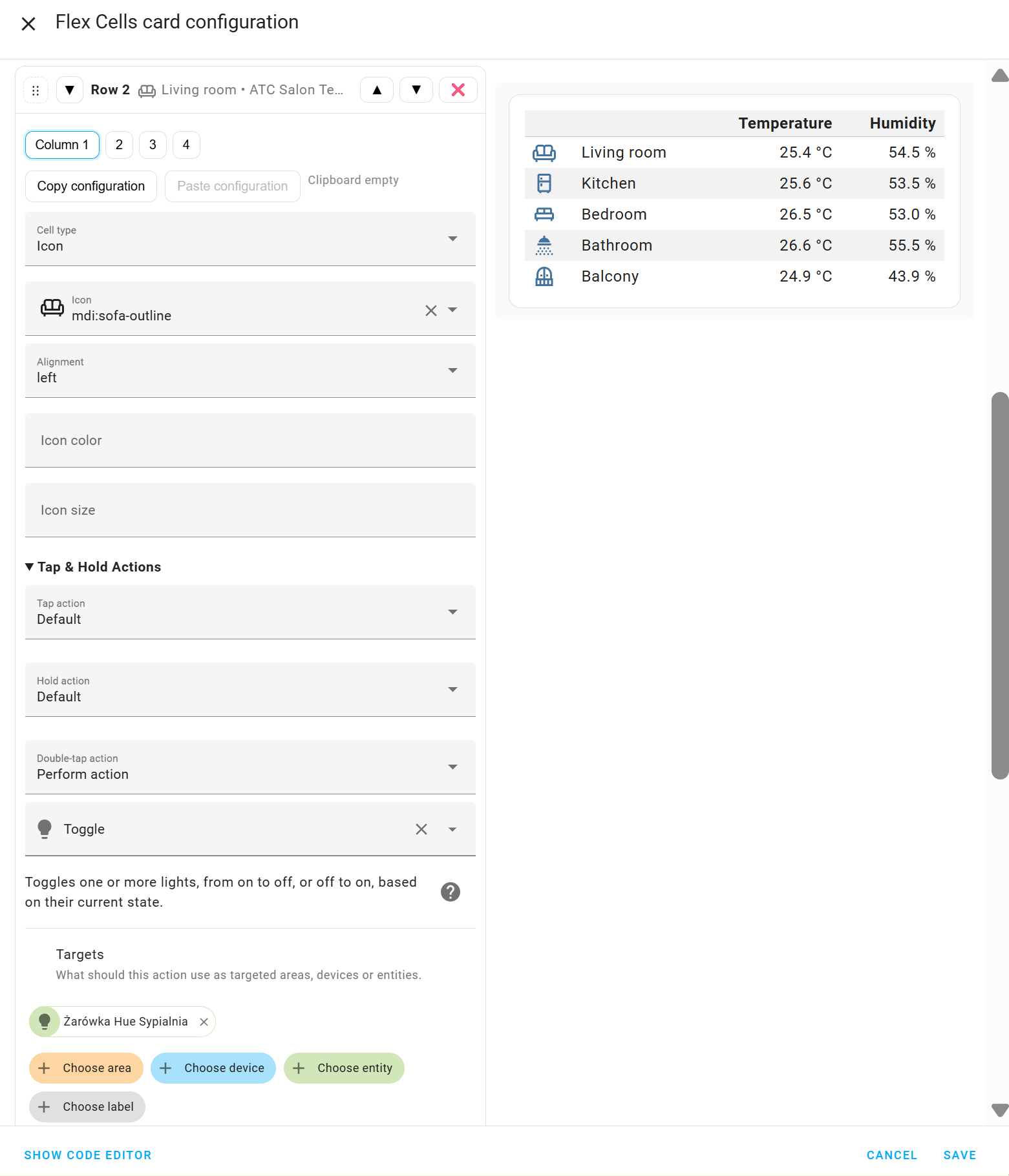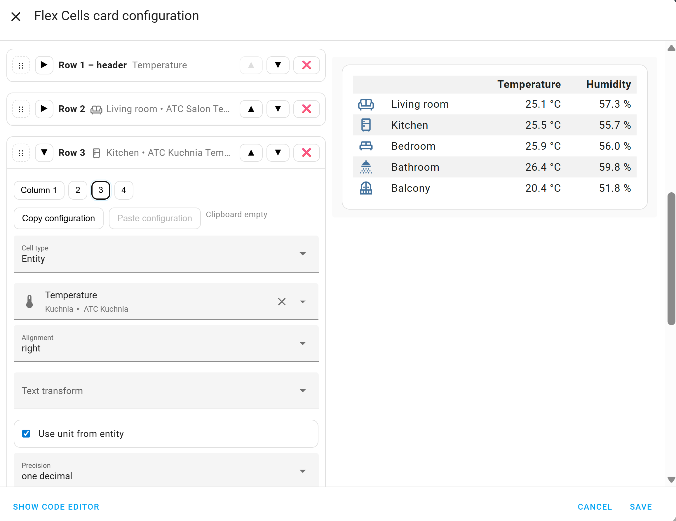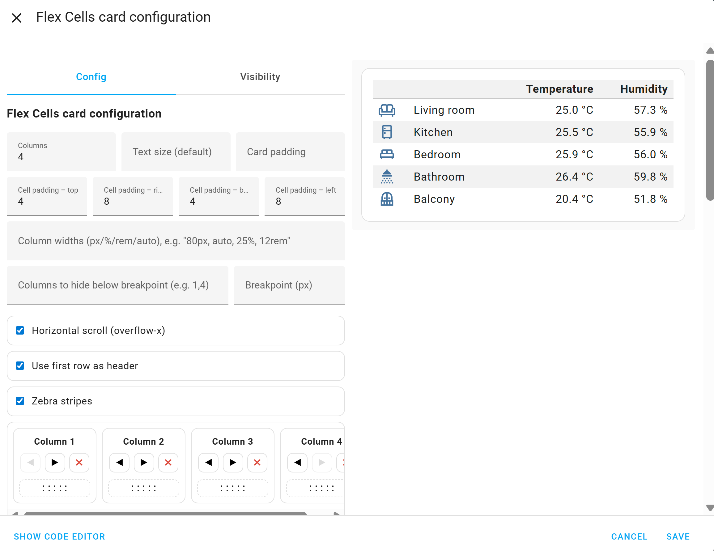 It lets you create table-like layouts with icons, text, or entities, configurable from a visual editor.