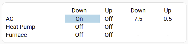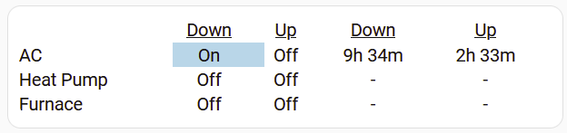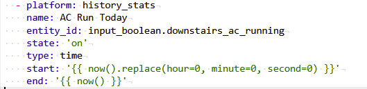 Unfortunately, the one I’m using in my table above is of type “time”. It’s a history_stats value that tells me how long the air conditioner has run today, created in YAML using: