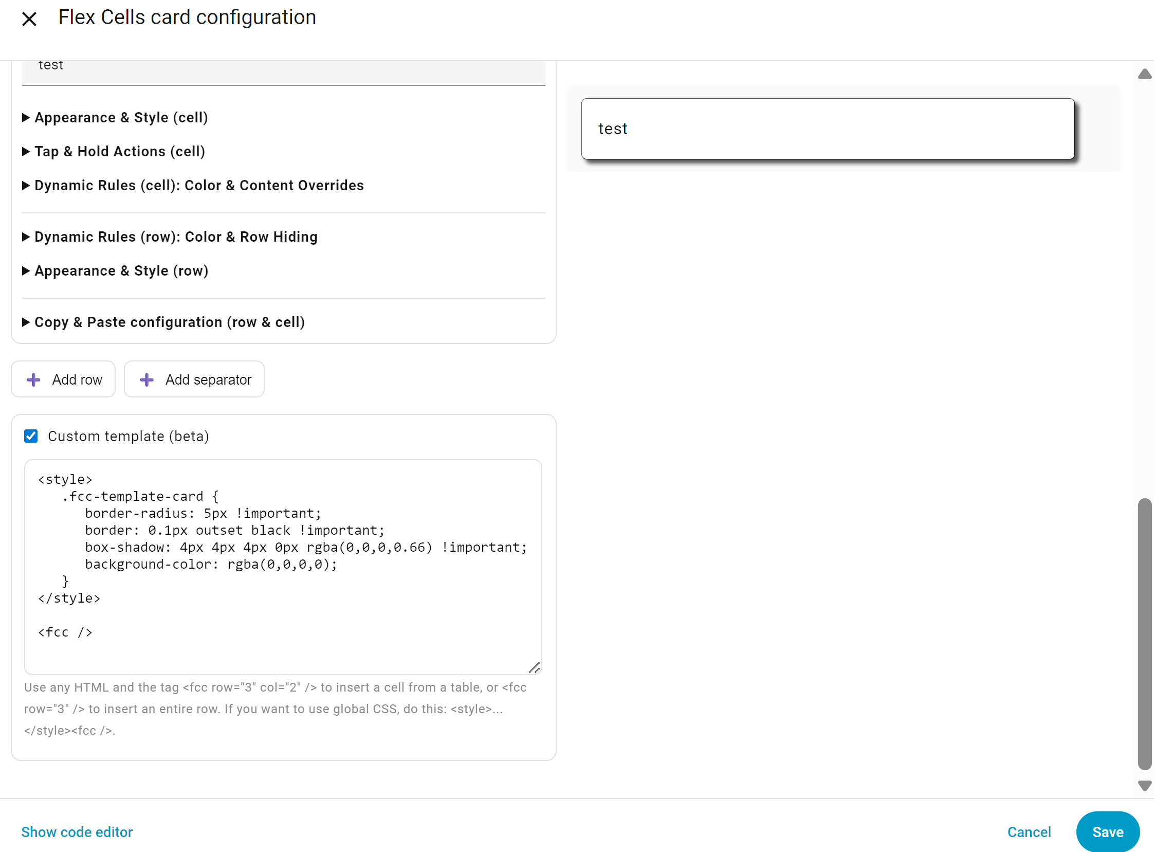 This is where you can write styles for the entire card. There’s also “custom CSS” for rows and cells.